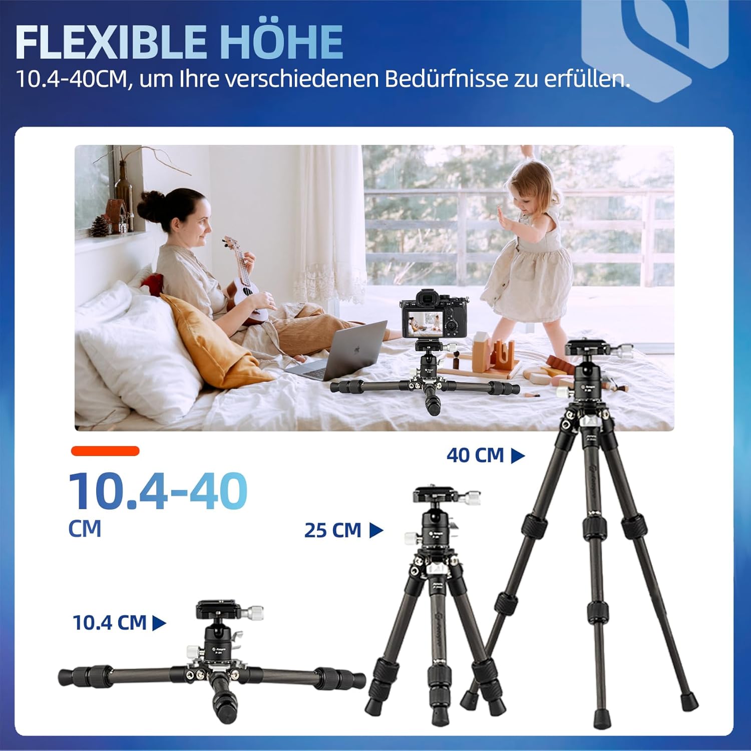 - [Langlebig & Stabil] Das nicht mittige Säulen-Design, verstärkt mit robuster 8K-Kohlefaser, bietet aussergewöhnliche Stabilität beim Schiessen. Das Mini-Reisestativ unterstützt bis zu 5 kg und ist kompatibel mit SLR/DSLR-Kameras (Sony, Nikon, Canon,