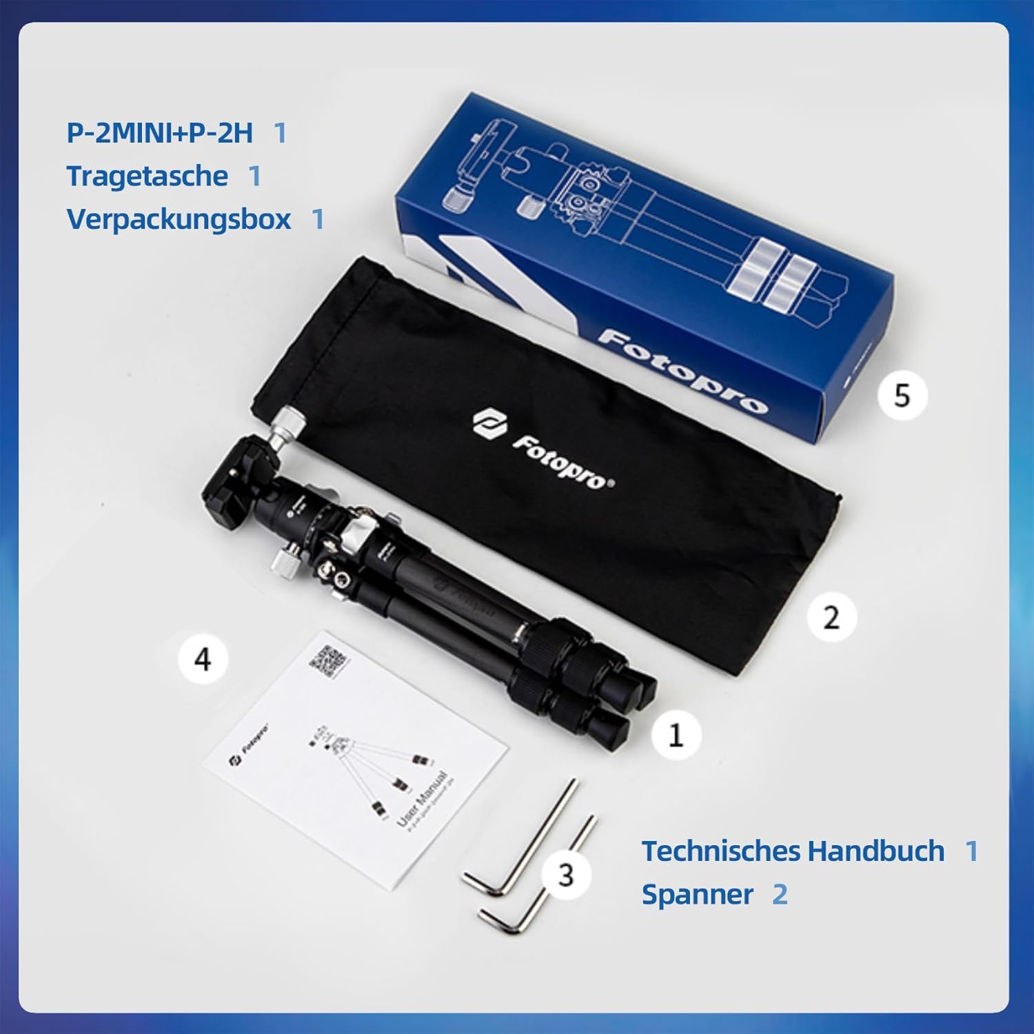 - [Leicht & Mini] Das Kohlefaser-Mini-Reisestativ ist leicht und kompakt. Es wiegt nur 0,4 kg, und seine Falthöhe von 25,9 cm macht es tragbar für Reisebedürfnisse. P-2 mini ist ein zuverlässiges Mini-Reisestativ und Rucksackstativ, immer bereit,