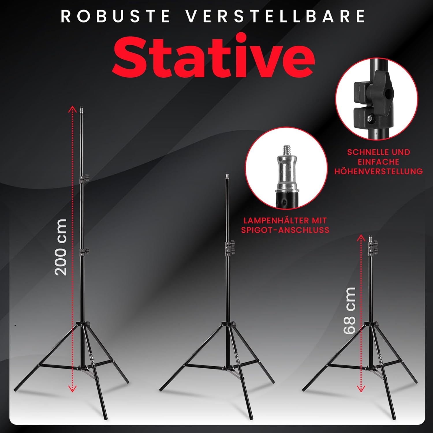 - 🚀 HOCHWERTIGE KONSTRUKTION - Die Softboxen und Stative sind aus langlebigen Materialien gefertigt. Die E27-Fassung macht es einfach, verschiedene Arten von Lampen anzuschliessen. Die Softboxen können um bis zu 210° gedreht werden und bieten so