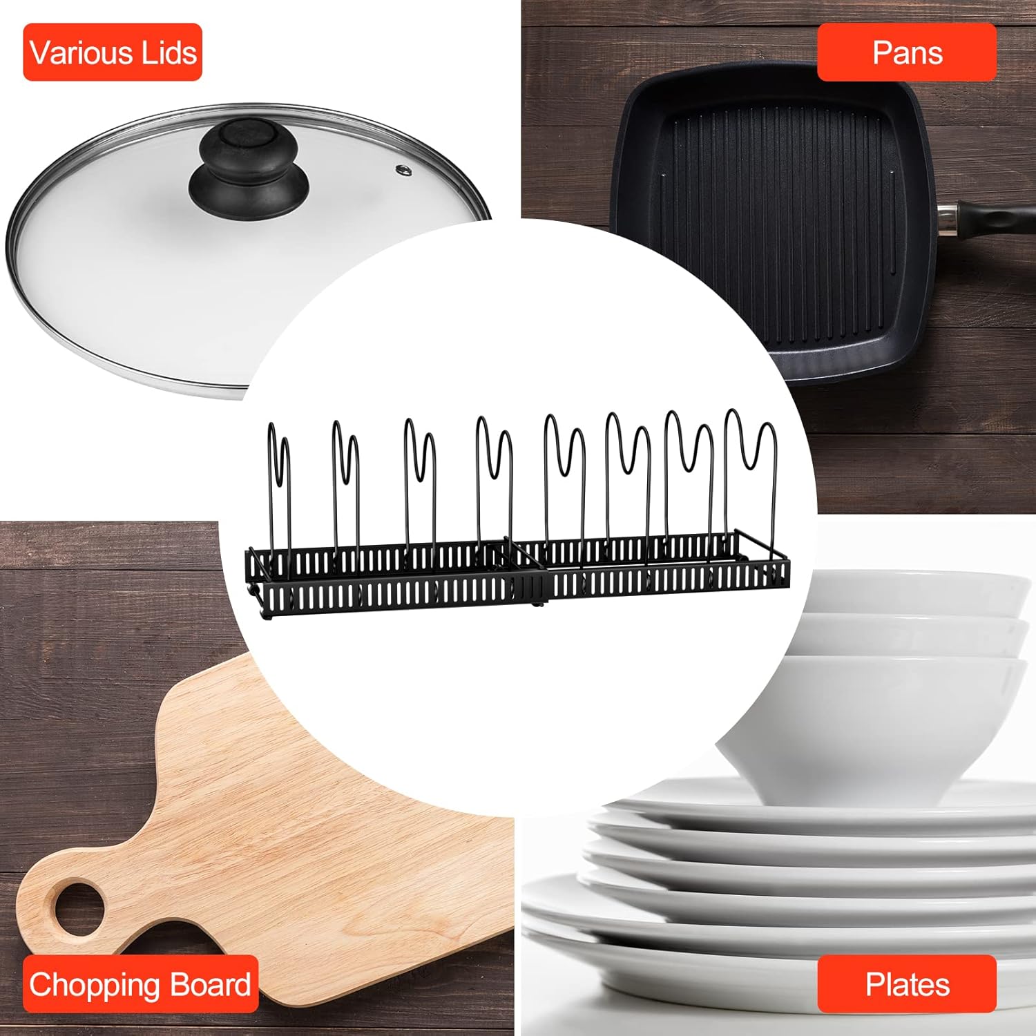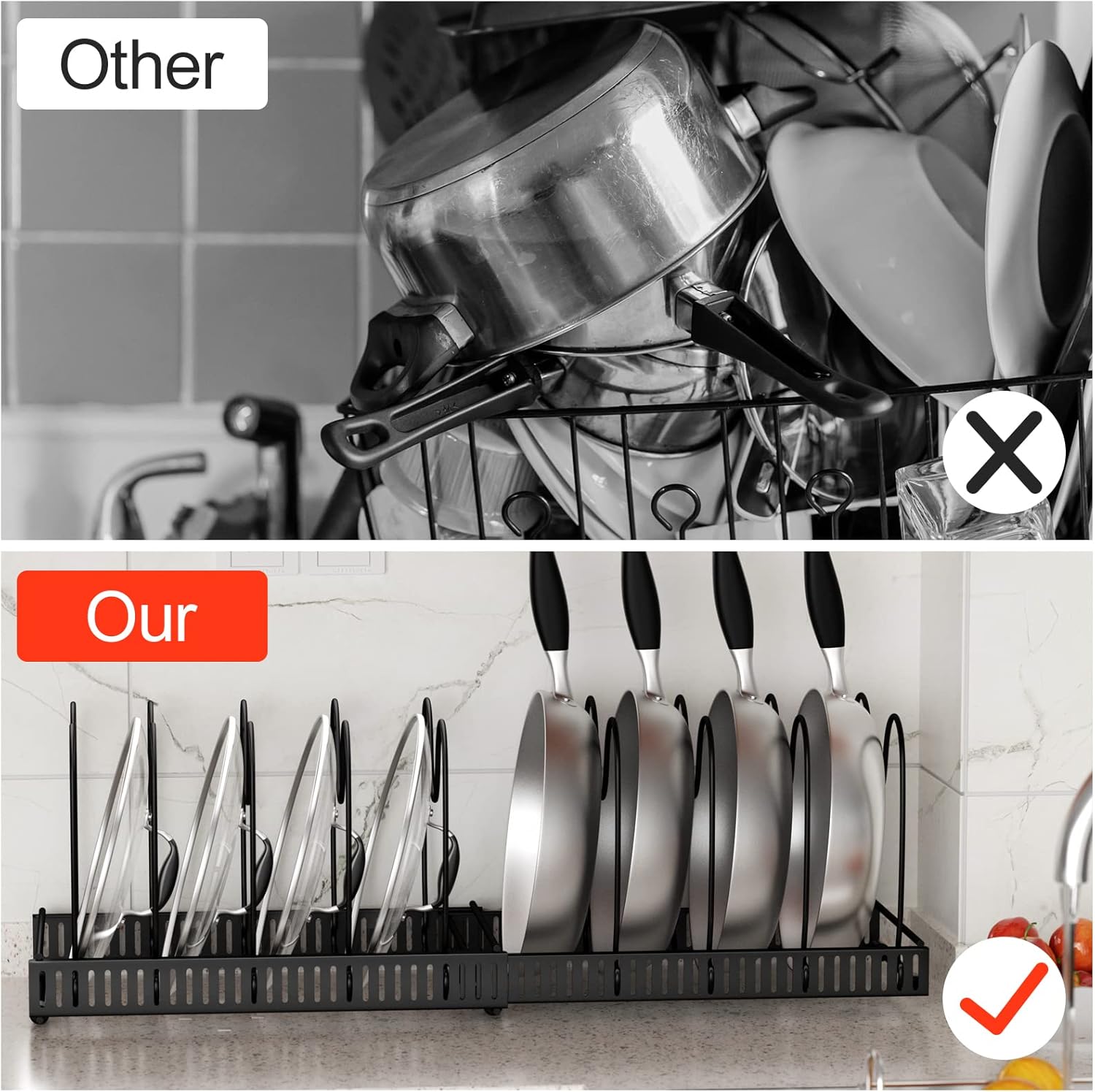 - 【Platzsparend】Die Pfannenregale für Schränke eignen sich sehr gut zum Aufbewahren aller Arten von Pfannen, Bratpfannen, Backformen, Topfdeckeln und Geschirr usw. Sie helfen, die Küche oder Schränke sauber und ordentlich zu halten, und sparen viel