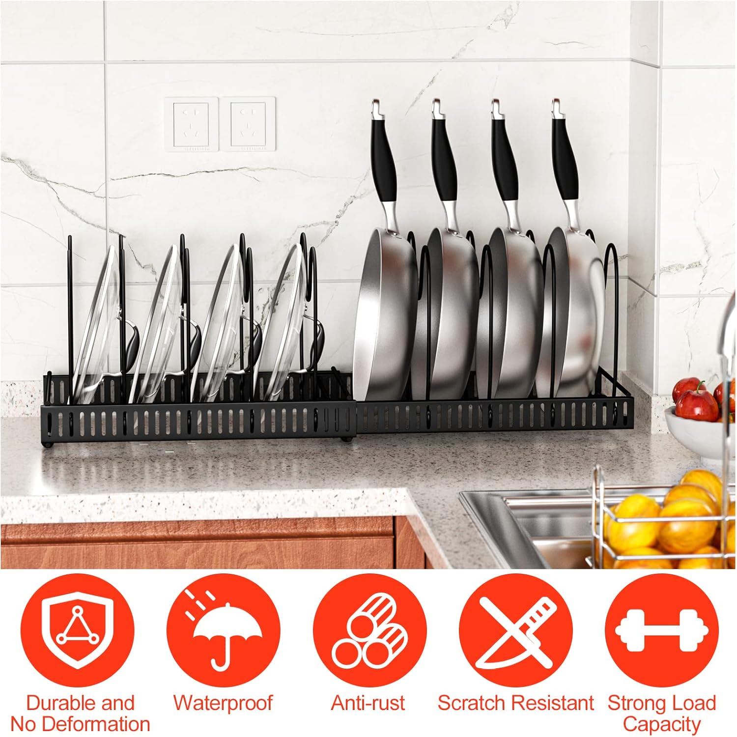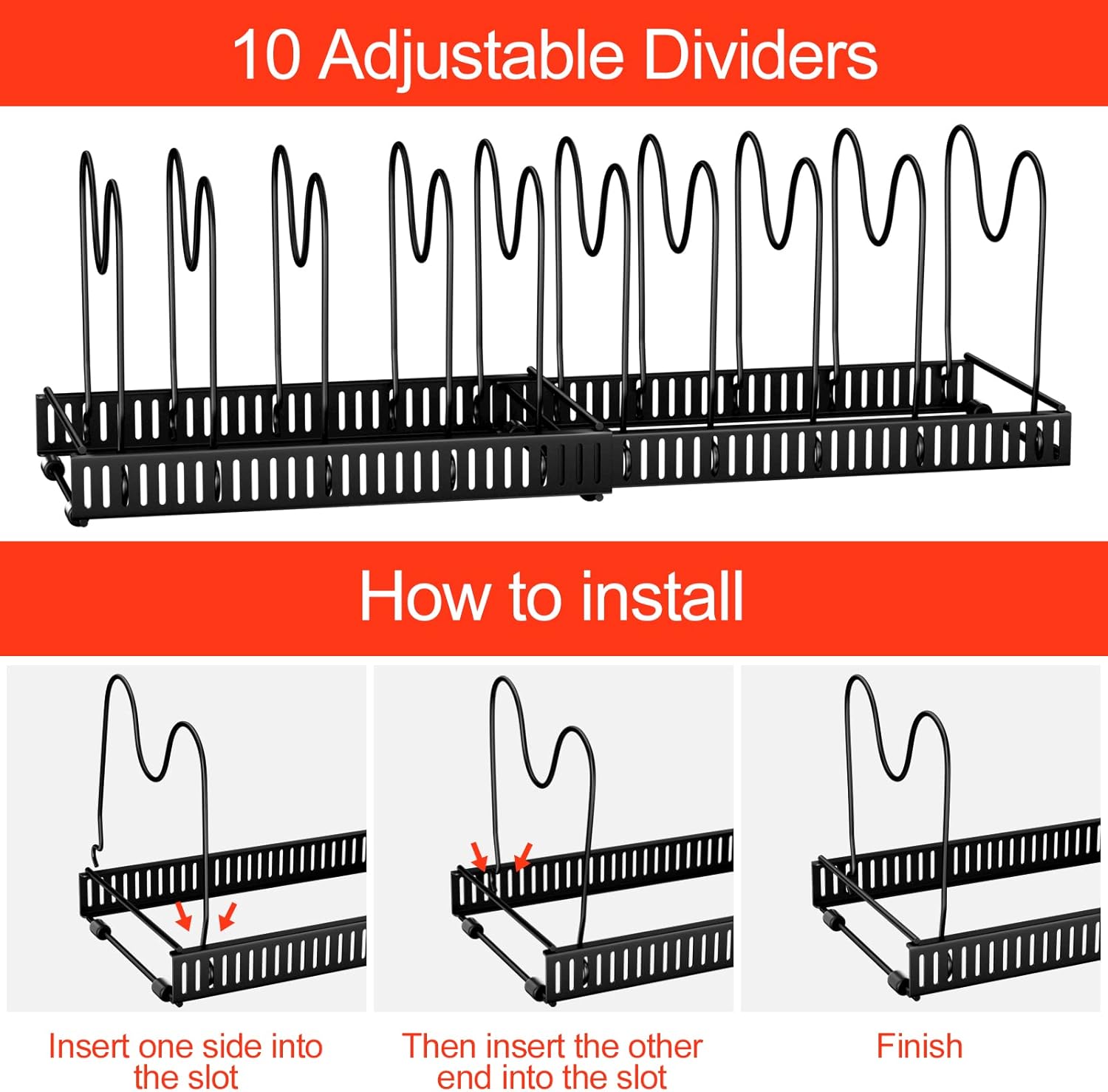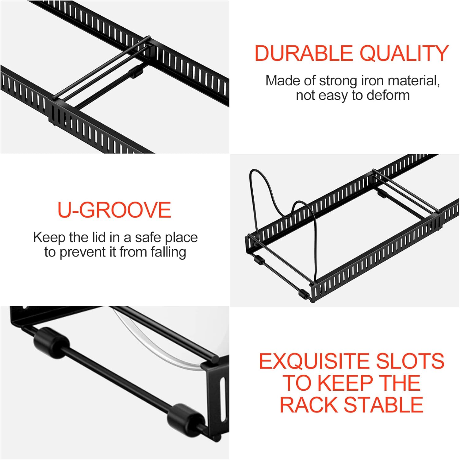 - 【Abnehmbare U-förmigen Rillen】Das Topfregal verfügt über 10 abnehmbare U-förmige Rillenteiler, die angepasst werden können, um Gegenstände unterschiedlicher Breite aufzunehmen, und das U-förmige Rillendesign kann den Topfdeckel stabil an Ort