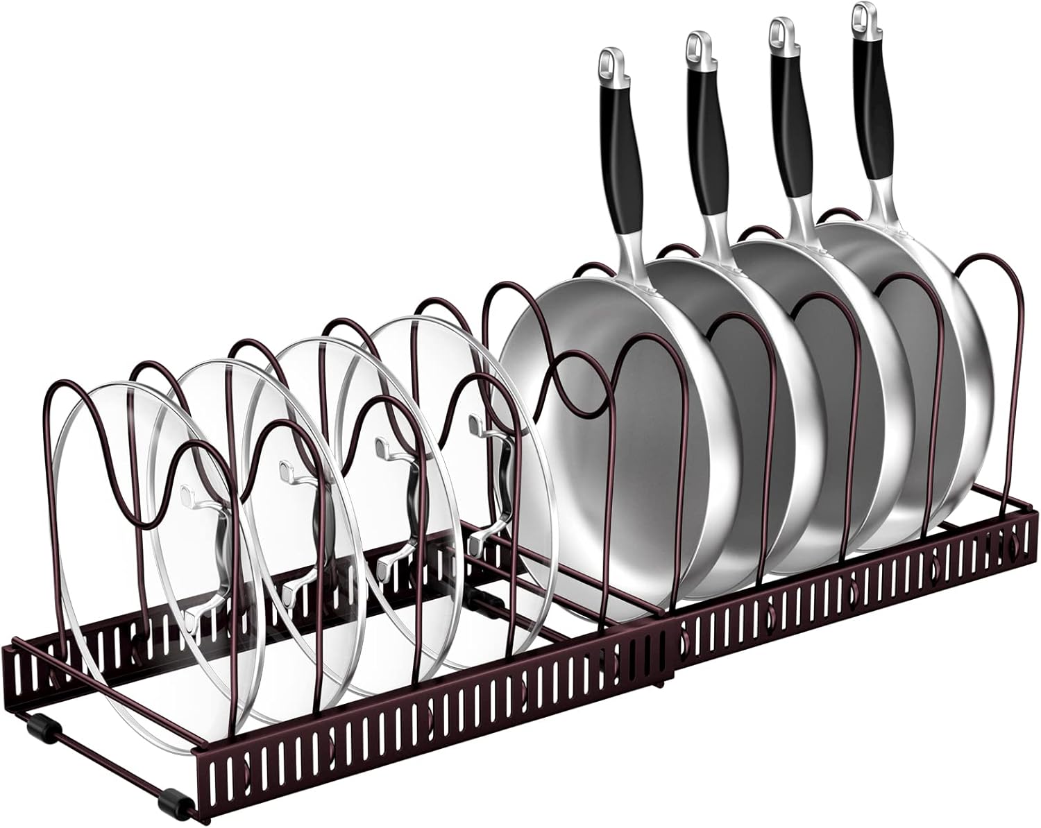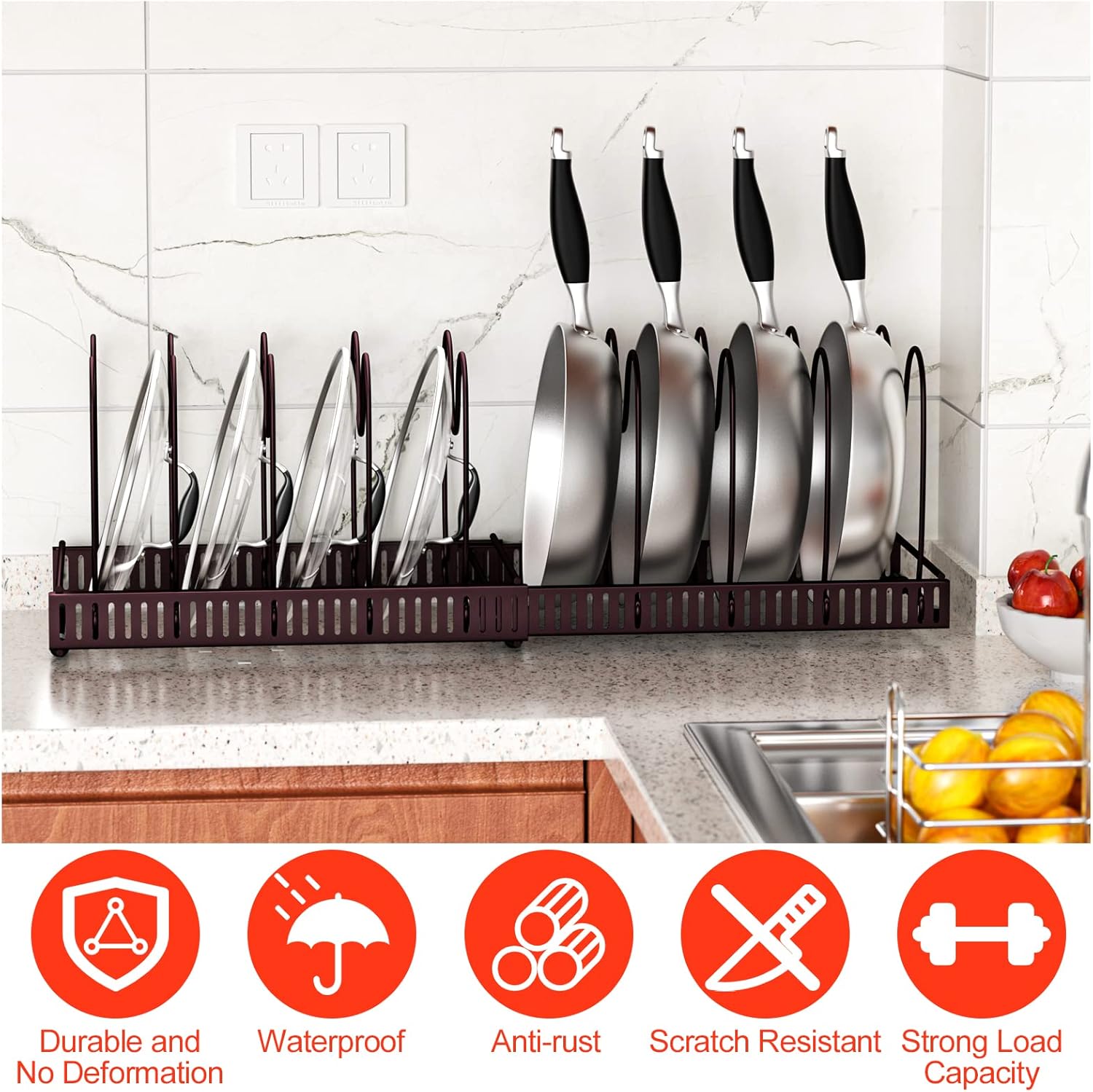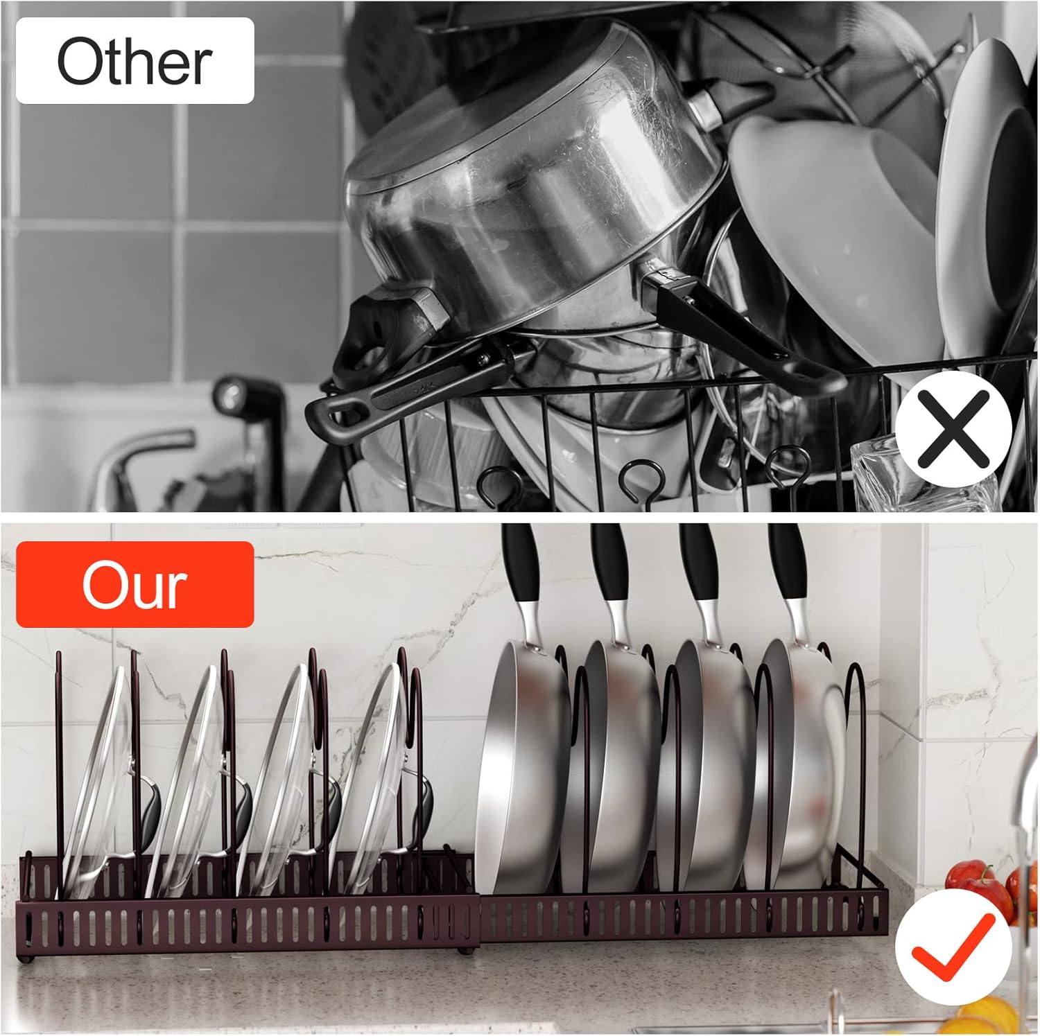 - 【Platzsparend】Die Pfannenregale für Schränke eignen sich sehr gut zum Aufbewahren aller Arten von Pfannen, Bratpfannen, Backformen, Topfdeckeln und Geschirr usw. Sie helfen, die Küche oder Schränke sauber und ordentlich zu halten, und sparen viel