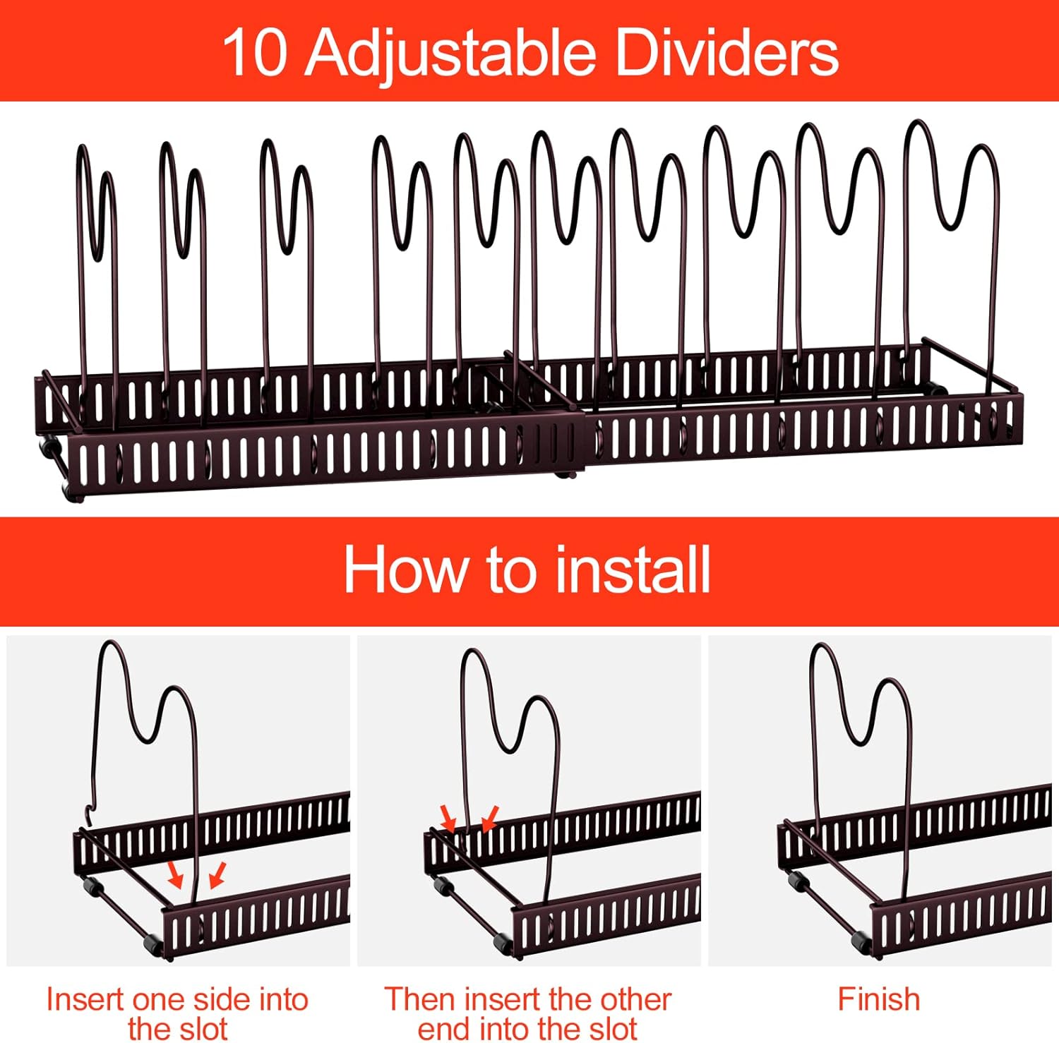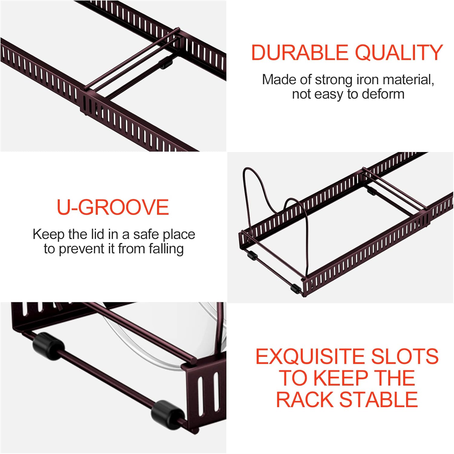 - 【Abnehmbare U-förmigen Rillen】Das Topfregal verfügt über 10 abnehmbare U-förmige Rillenteiler, die angepasst werden können, um Gegenstände unterschiedlicher Breite aufzunehmen, und das U-förmige Rillendesign kann den Topfdeckel stabil an Ort