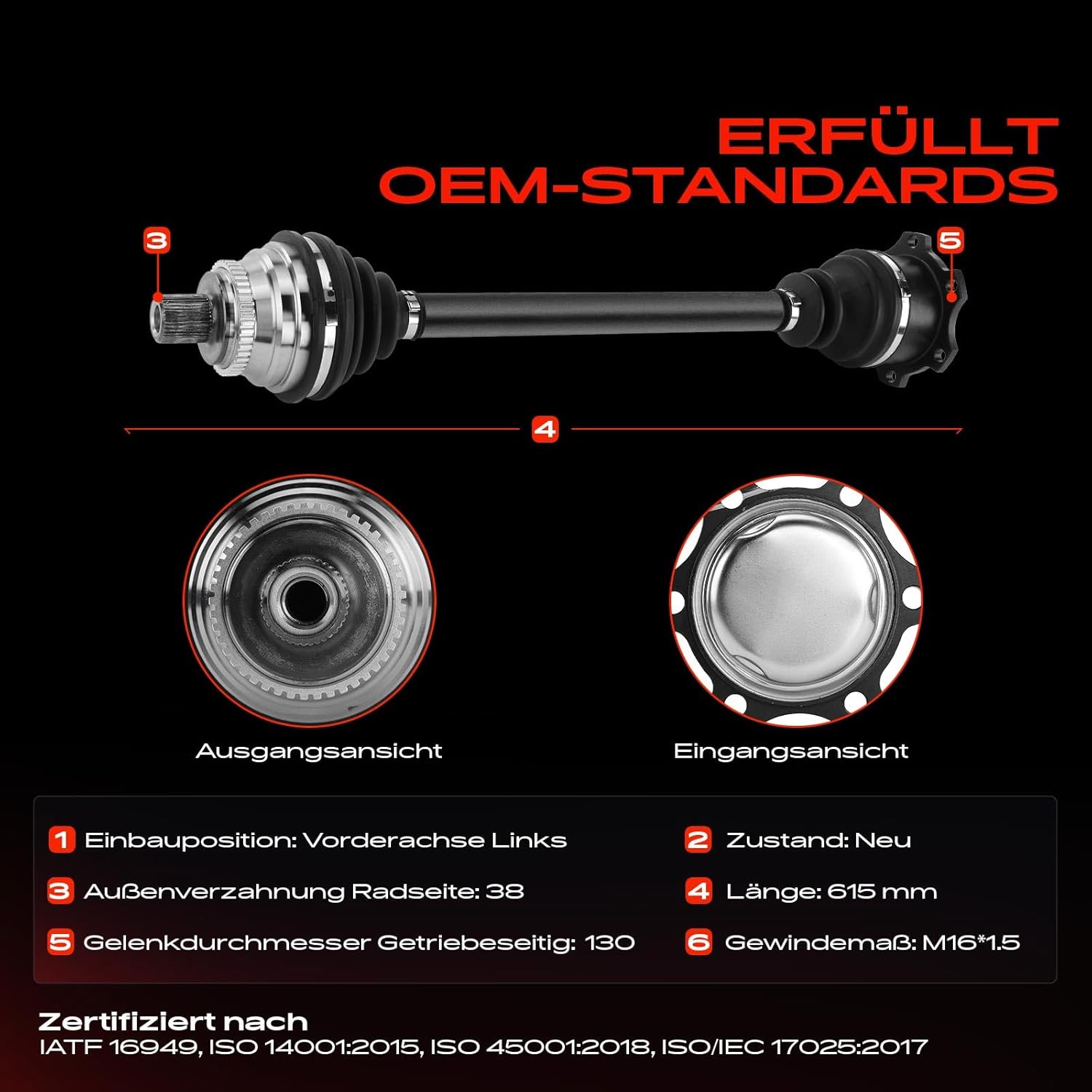 - 【Technische Info.】Länge [mm]: ca. 613; Verzahnung Radseite: 38; Zähnezahl ABS-Ring: 45; Gelenkdurchmesser getriebeseitig [mm]: ca. 130; Getriebeart: Schaltgetriebe