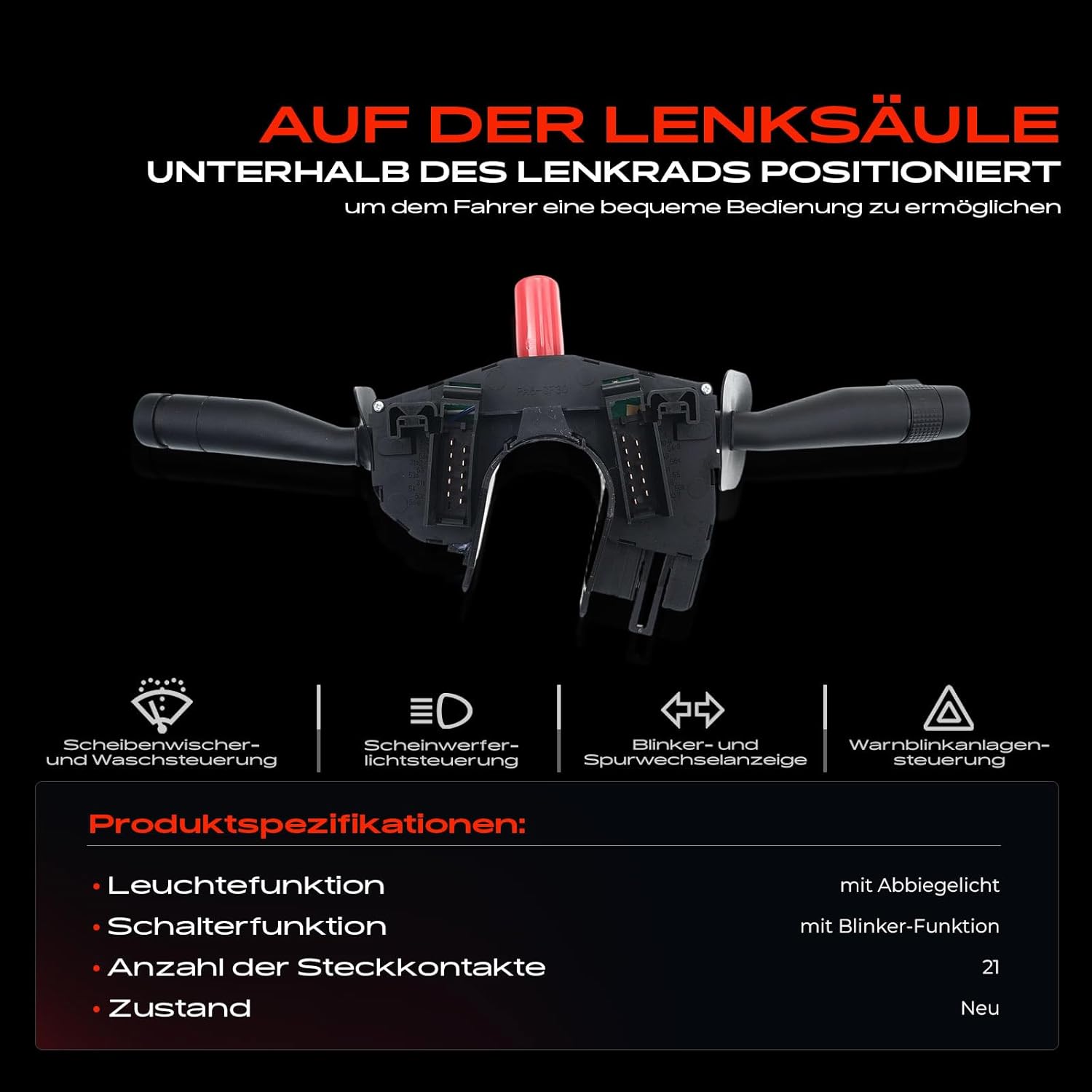 - 【Schalterfunktion】mit Blinker-Funktion, mit Wisch-Wasch-Funktion, mit Wischintervall-Funktion, mit Heck-Wisch-Wasch-Funktion, mit Fernlicht-Funktion, mit Warnblinkanlage-Funktion