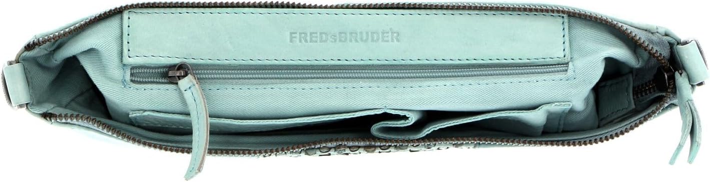 PRODUKTBESCHREIBUNGEN FREDsBRUDER Umhängetasche im schlichten Design Daten Umhängetasche: o Masse: Breite ca. 29 cm, Höhe ca. 23 cm, Tiefe ca. 4 cm o Gewicht: ca. 437 g o Farbe: Shy Mint (Türkis) o 1 Schulterriemen stufenlos verstellbar, abnehmbar: ca. 87 cm - 112 cm o Material: Aussen Rindsleder, innen Baumwolle, Polyester o Lieferumfang: FREDsBRUDER Umhängetasche mit Etikett, Schulterriemen, Staubbeutel Ausstattung Umhängetasche: o Umhängetasche wird mit Zipper geschlossen o Im Hauptfach 3 Einschubfächer und 1 Zipperfach o Besitzt geräumiges Hauptfach o Das FREDsBRUDER Logo ist gut sichtbar eingearbeitet FREDsBRUDER Eye Nicki - Die Umhängetasche für modebewusste Frauen Wenn Sie mit der FREDsBRUDER Eye Nicki Tasche in die Stadt gehen, müssen Sie damit rechnen, dass Sie im Mittelpunkt stehen. Das schlichte aber schicke Design ist der absolute Hingucker. Ausserdem bekommen Sie alle Ihre Utensilien ohne Probleme in den Fächern unter. Mit dem abnehmbaren und verstellbaren Schulterriemen können Sie ganz individuell entscheiden, auf welche Art Sie die Tasche tragen möchten.