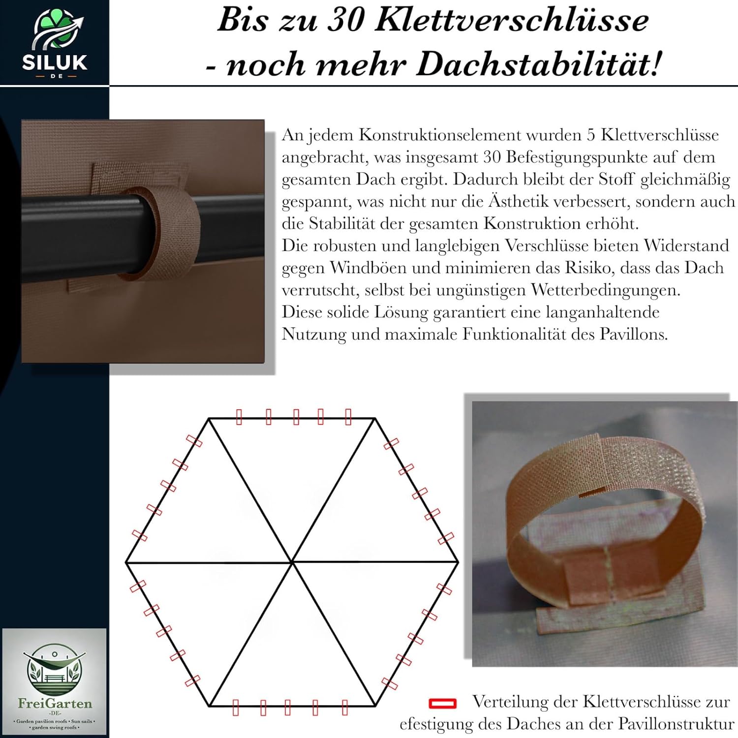 - Das Dach hat ein System der Klettverschlüsse, mit denen man das Dach auf einfache Weise an die Pavillonkonstruktion befestigen kann.