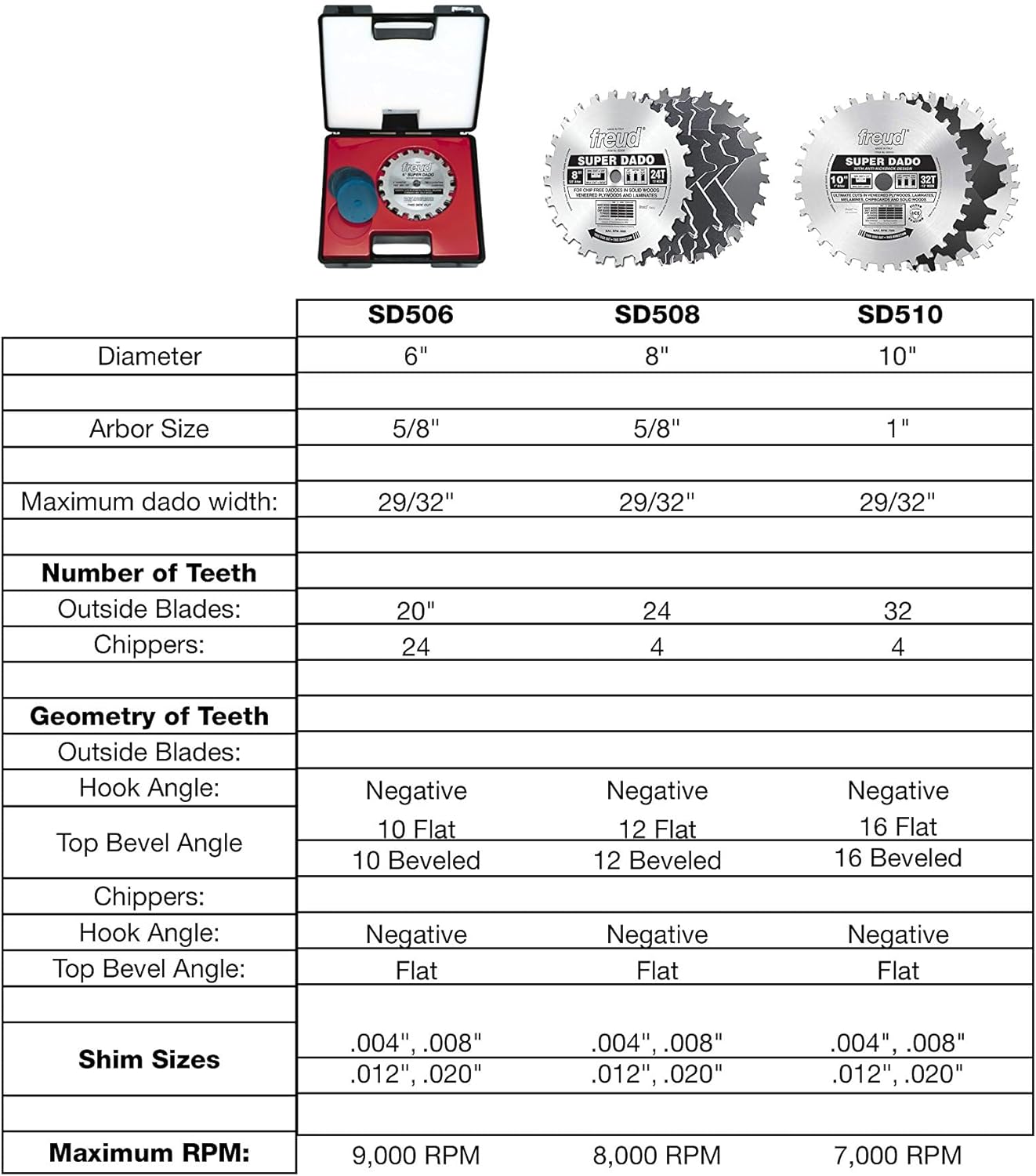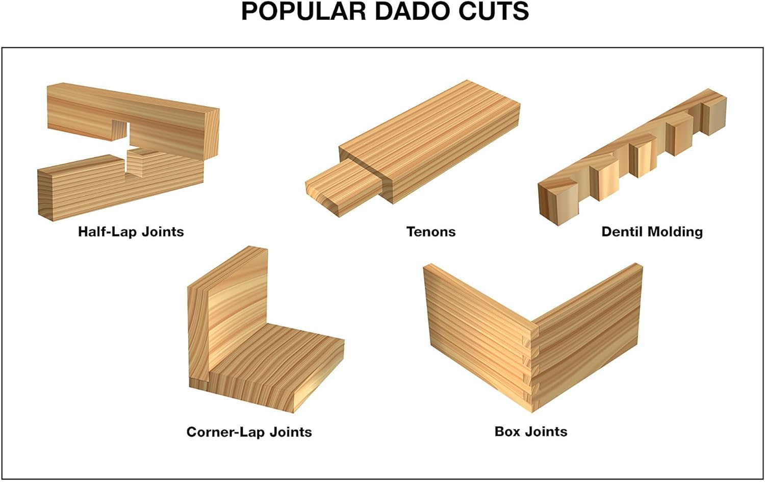 - Schnitte Dado breiten von 1/10,2 cm bis 29/81,3 cm (in 1/81,3 cm Schritten); zur Verfügung: Tischkreissäge, tragbarer Tisch sah, radial Arm Säge