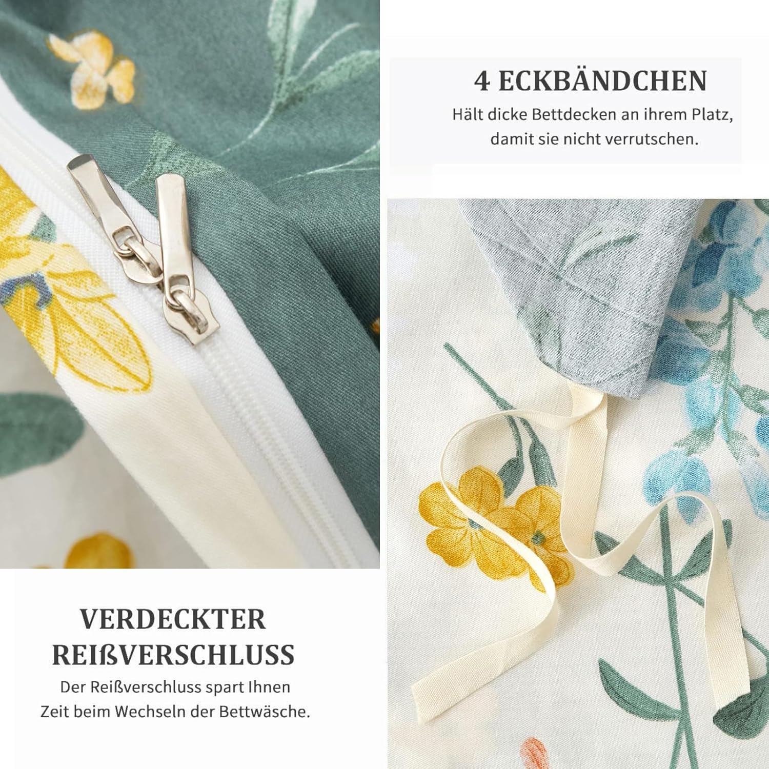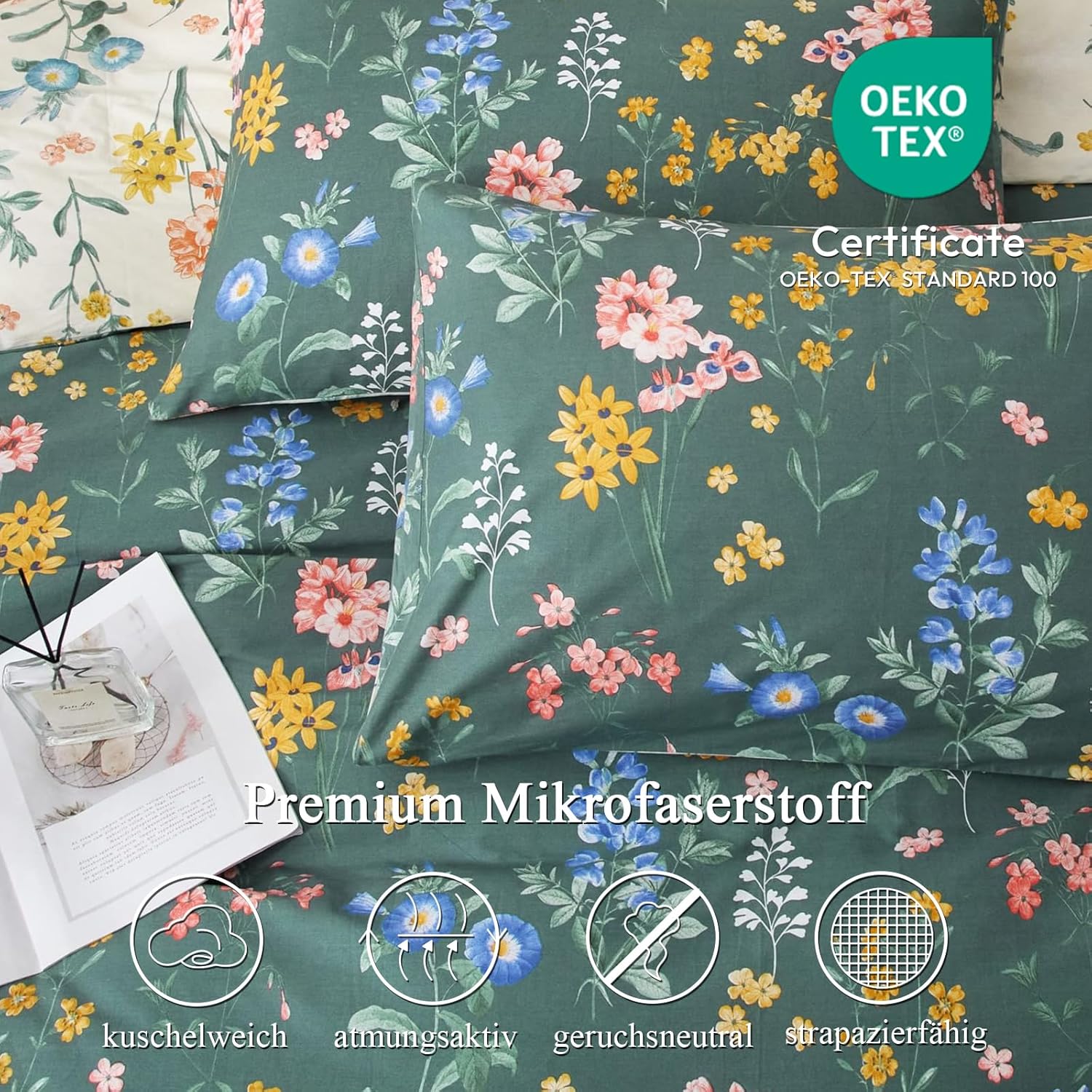 Freyamy Bettwäsche 135x200cm 2teilig Grün Dunkelgrün Bunt Blumen Blätter Pflanzen Wendebettwäsche Fl