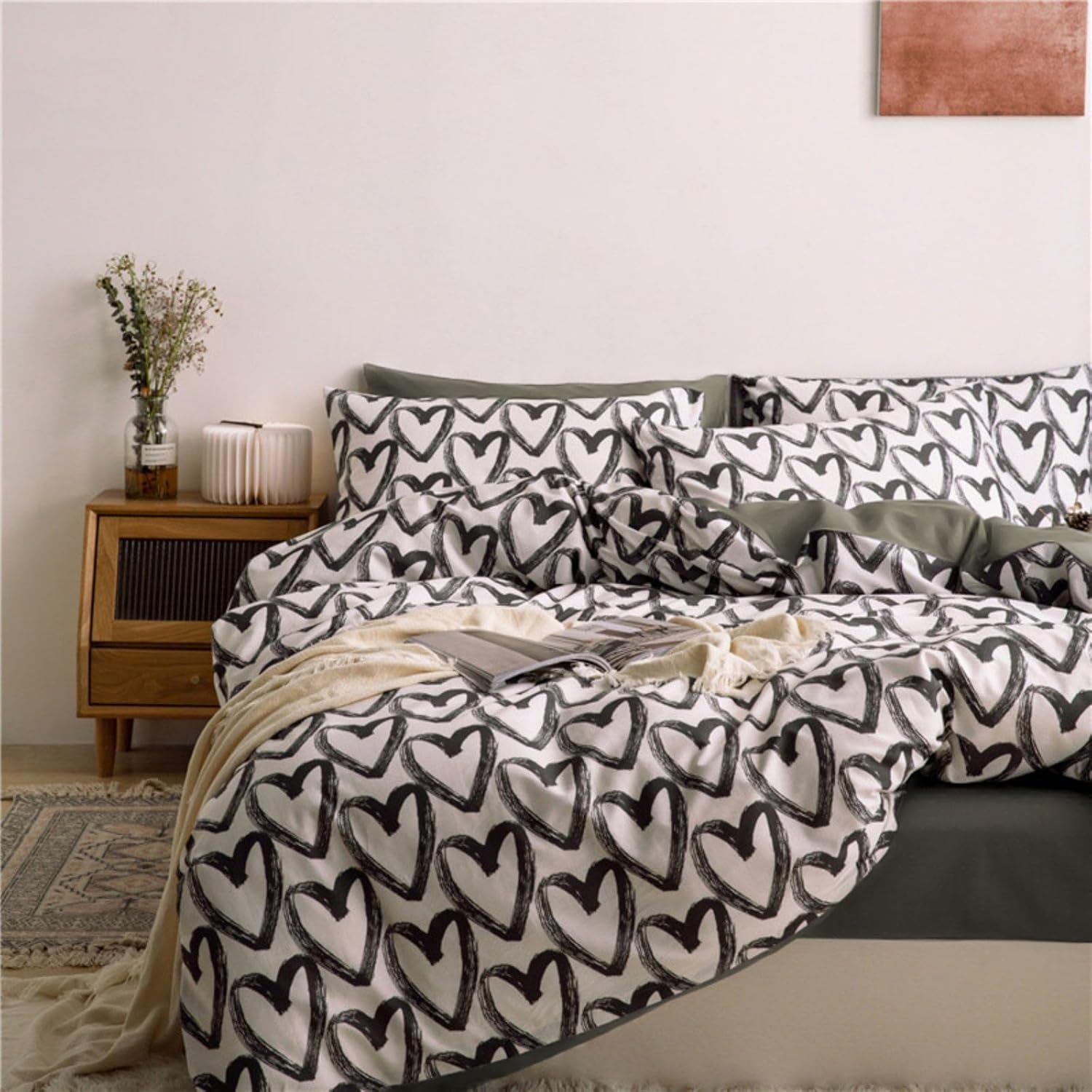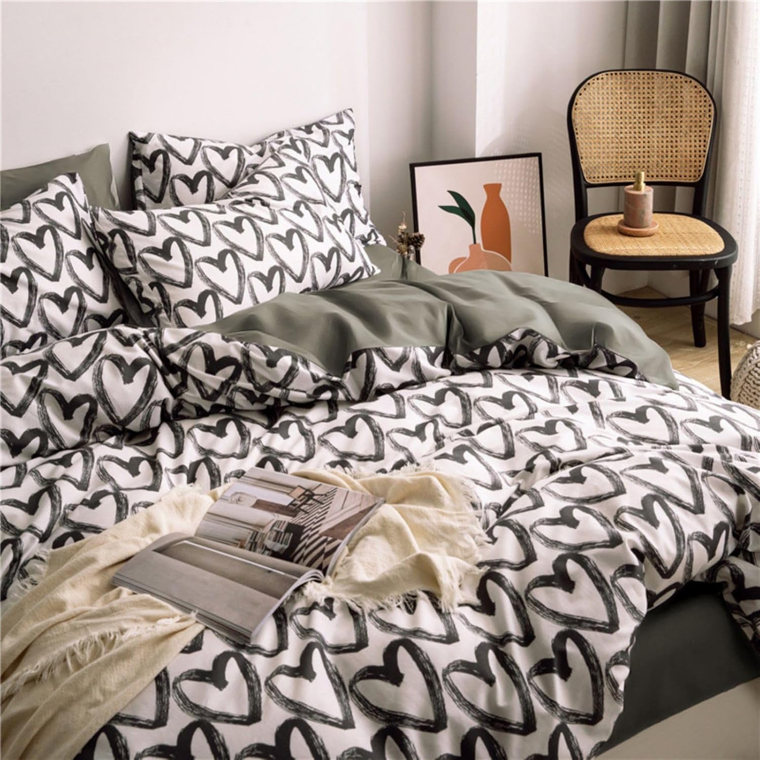 Freyamy Bettwäsche 200x220cm 3teilig Schwarz Weiss Herz Bettwaren-Sets Gebürstet Microfaser Weiche W
