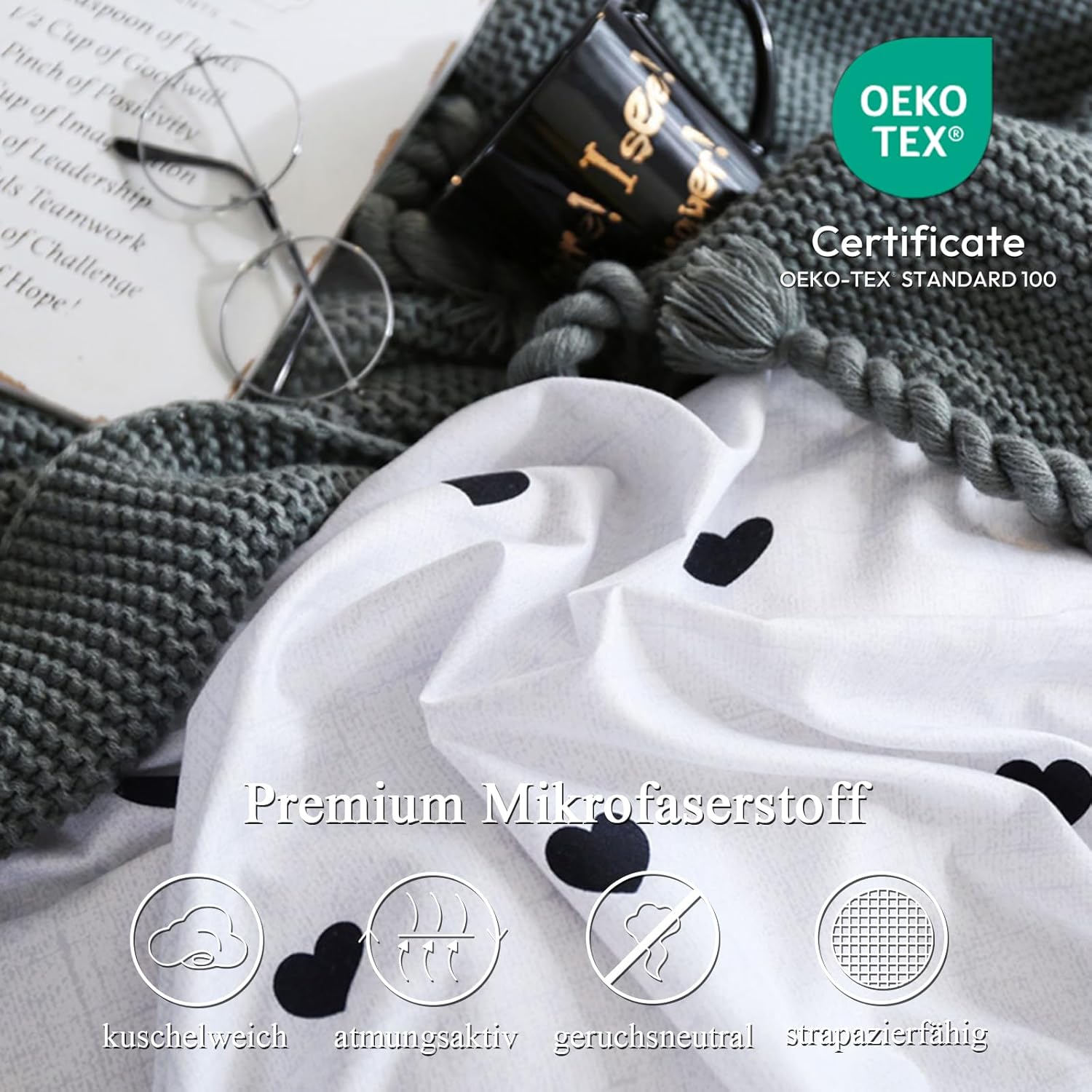 Freyamy Bettwäsche 220x240cm 3teilig Weiss Schwarz Herz Bettwaren-Sets Gebürstet Microfaser Weiche W