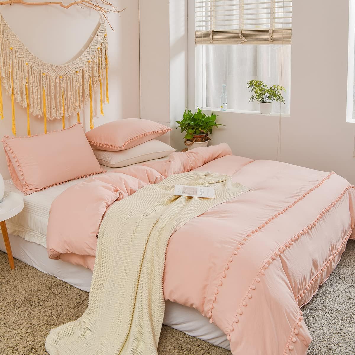- ❤Pompon-Fransen-Design: Der Bettbezug und die Kissenbezüge sind von Pompon-Fransen umgeben. Die winzigen Pompons in den beliebtesten Farben sind elegant und stilvoll und verleihen dem Bettbezug einen luxuriösen Look. Der Bohème-Stil passt perfekt zu