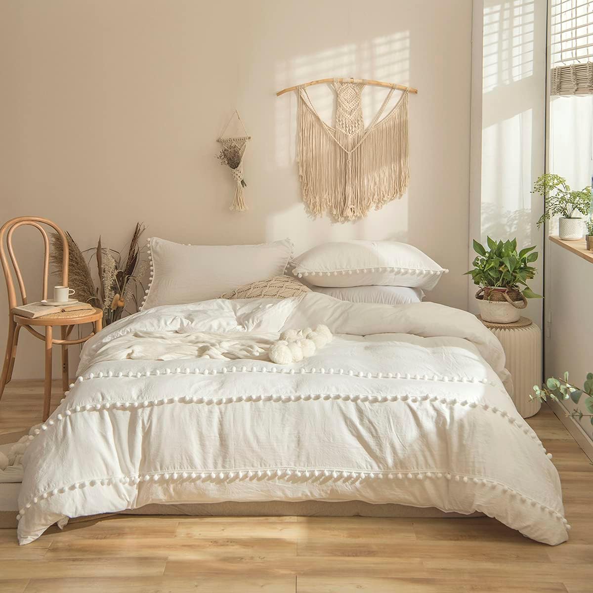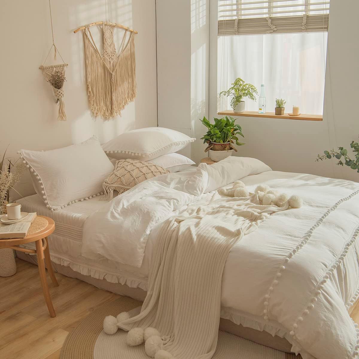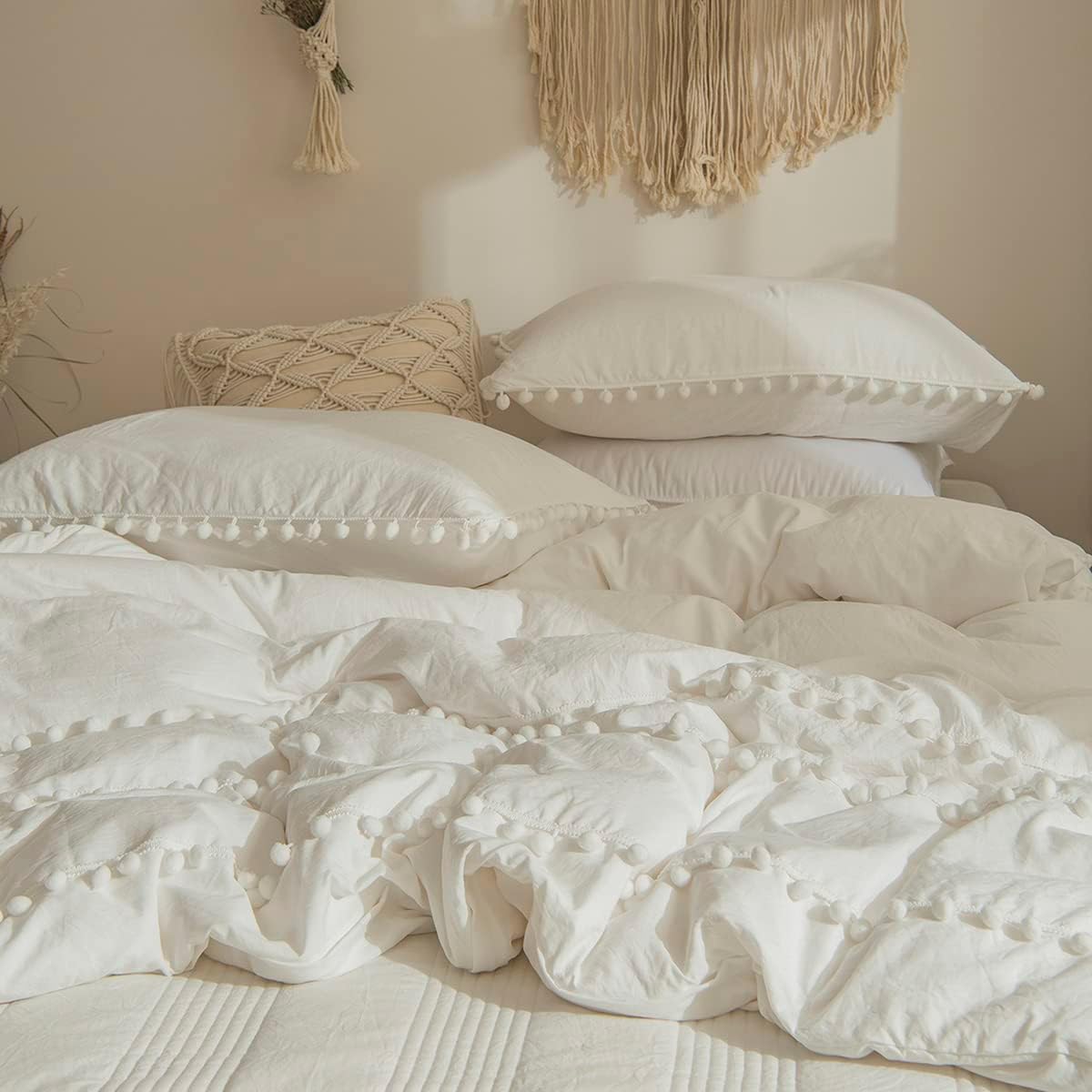 - ❤Pompon-Fransen-Design: Der Bettbezug und die Kissenbezüge sind von Pompon-Fransen umgeben. Die winzigen Pompons in den beliebtesten Farben sind elegant und stilvoll und verleihen dem Bettbezug einen luxuriösen Look. Der Bohème-Stil passt perfekt zu