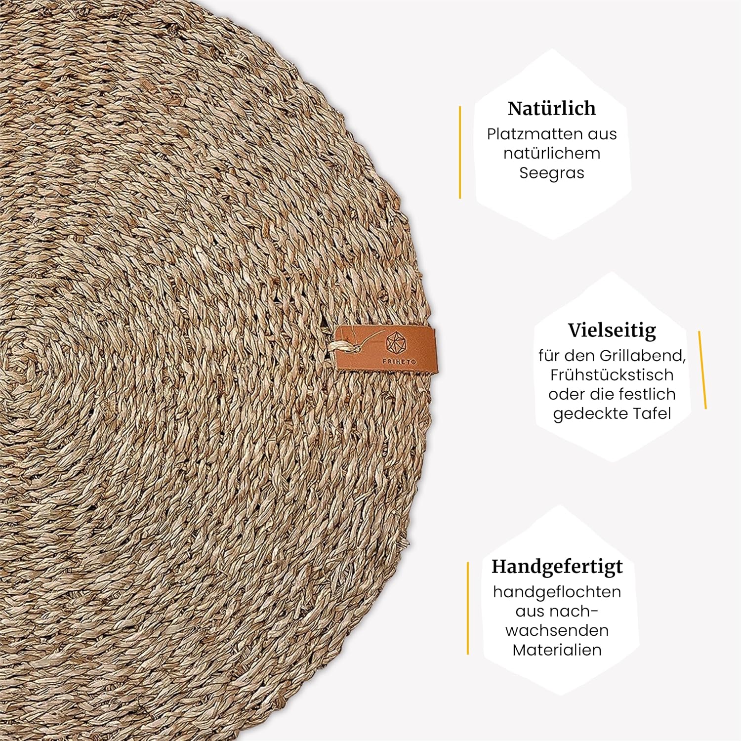- Nachhaltig: Handgefertigt aus geflochtenem Seegras, präsentieren sich diese Unterlagen in klassischer Naturfarbe. Das FRIHET Lederlabel verleiht eine elegante Note. Die Platzsets benötigen möglicherweise eine Weile, um sich nach dem Transport flach an