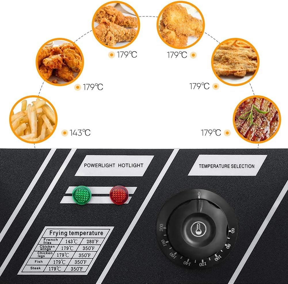 - Komfortables Design: Die Edelstahlabdeckung ist in der elektrischen fritteuse, um kochendes Ölspritzen zu vermeiden. ABS-Zifferblatt, die Temperatur kann zum Braten von Lebensmitteln zwischen 60 und 200 ° C eingestellt werden. Alle Komponenten,