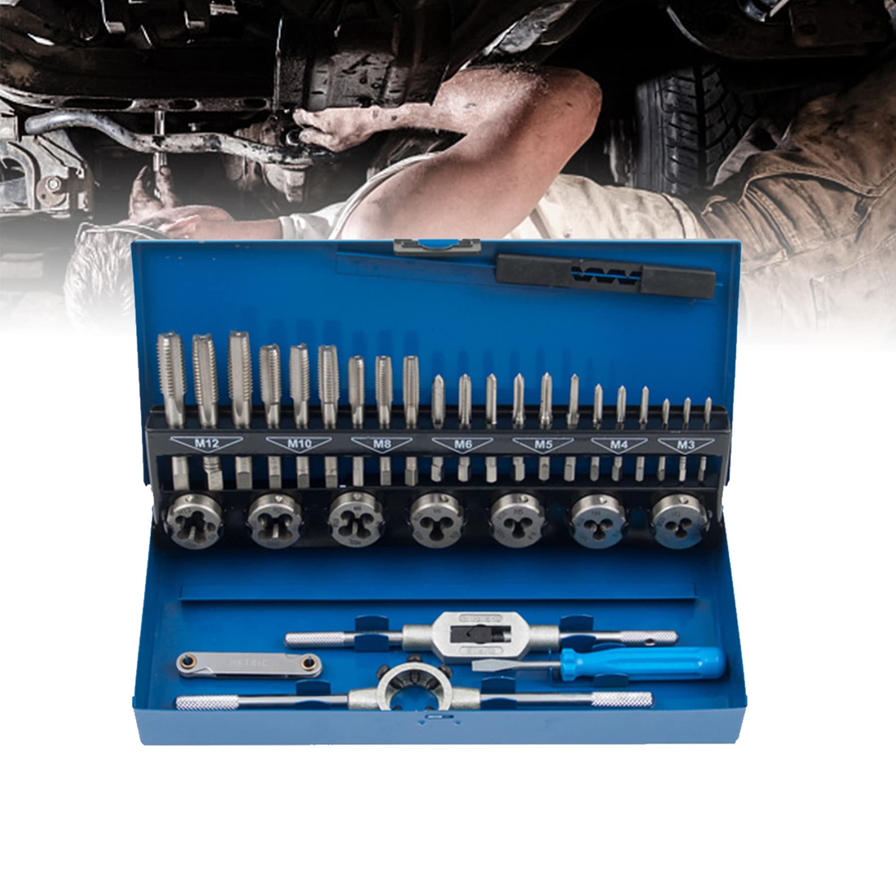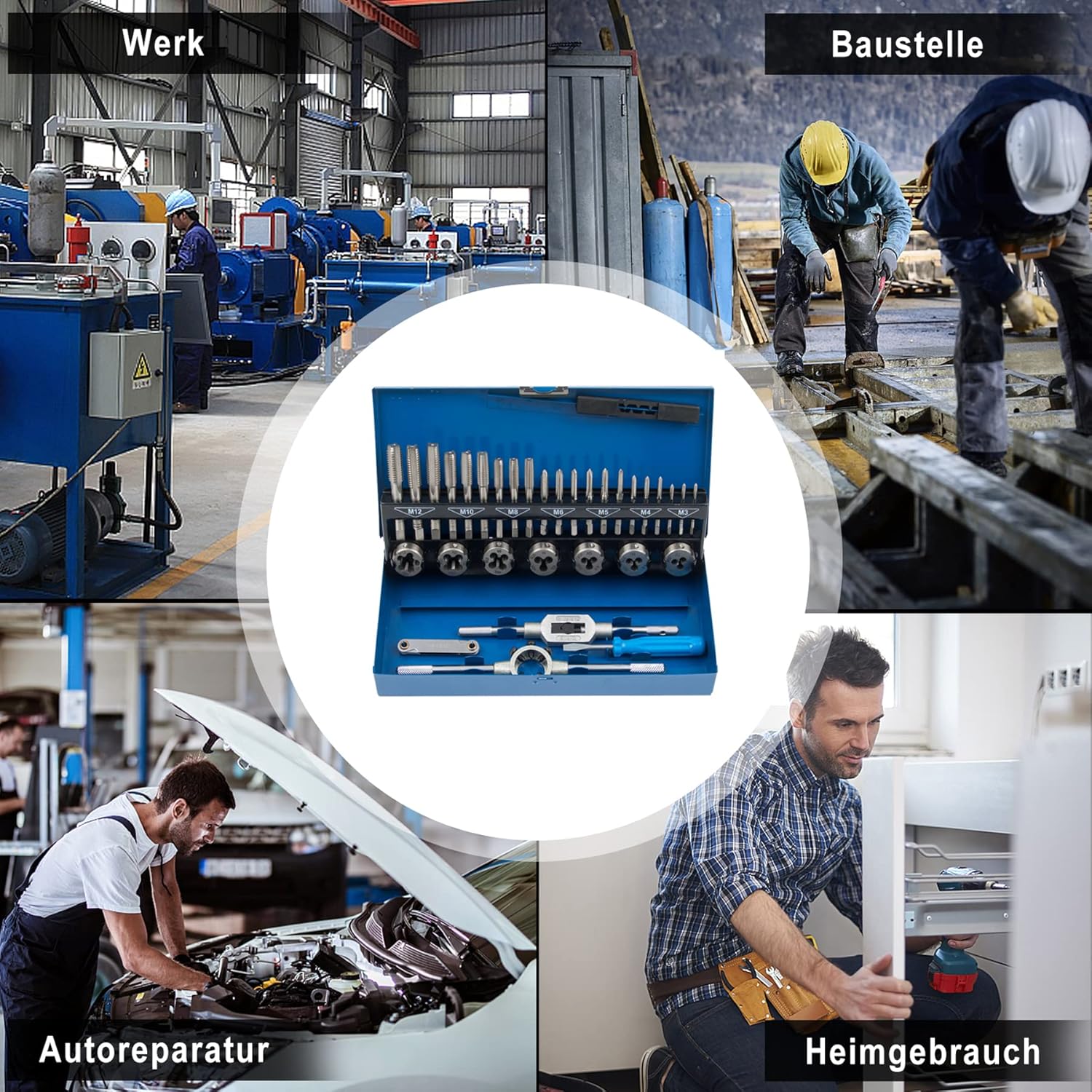 - 【Stark und Stabil】32-teiliger Gewindeschneidsatz aus Wolframstahl für unlegierte und niedrig legierte Stähle, Temperguss und Nichteisenmetalle bis 900 N/mm². Die Verstärkerstange ist rutschfest und sicher in der Anwendung. Er zeichnet sich durch