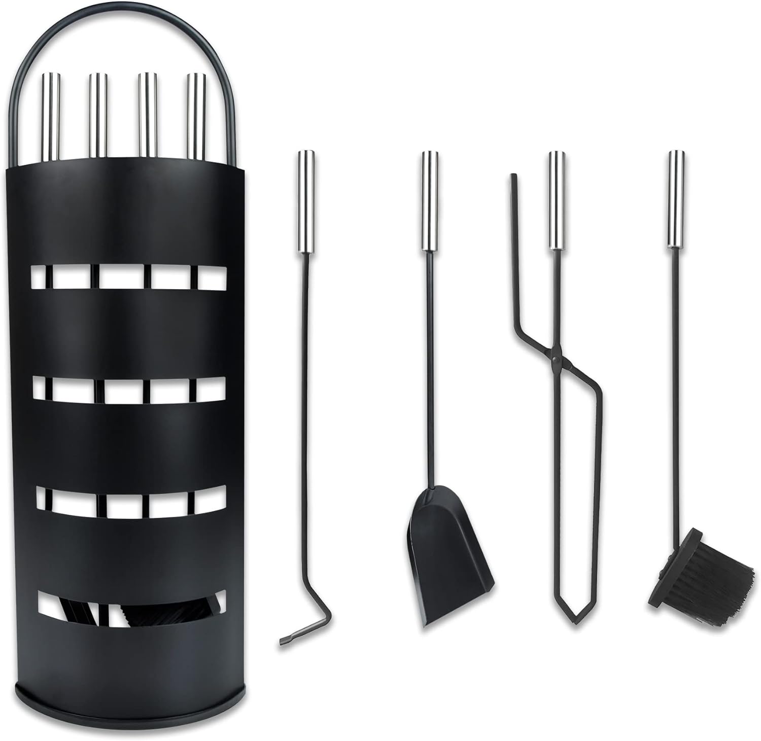 - 【Kaminbesteck Gusseisen】Gesamtproduktgrösse(LxBxH): 23x15x67cm, Material: Edelstahl + Eisen mit Pulverbehandlung oberfläche, Farbe: Silber / Schwarz, Nettogewicht: 2,5KG. Produkt Inkl. 1x Maske, 1x Ablage, 1x Sockel, 1x Clip(55x10cm), 1x Schaufel (55x11,5cm), 1x Feuerstab(56x8cm), 1x Pinsel(55x10cm).