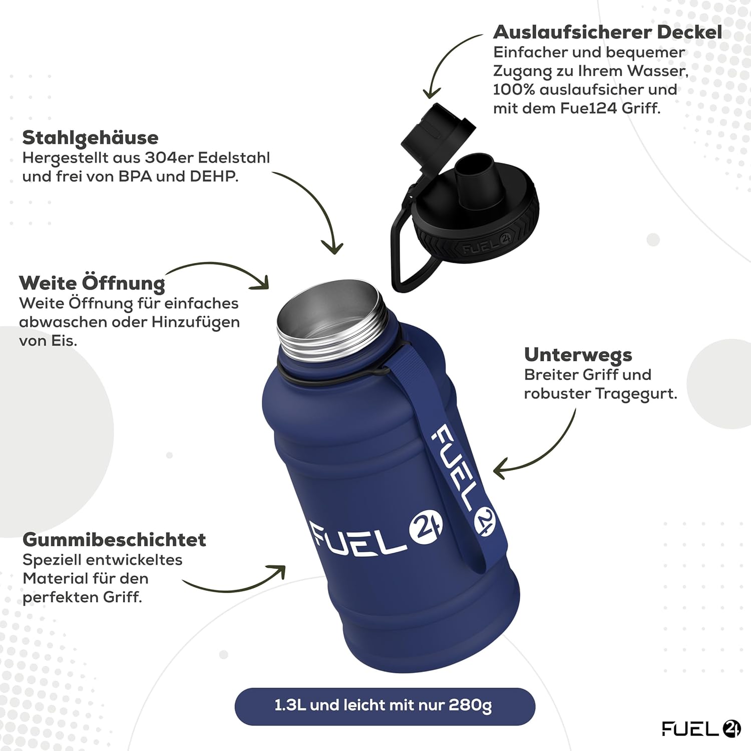 - auslaufsicher – einfacher und bequemer Zugang zu Ihrem Wasser und ist 100% auslaufsicher und kommt mit unserem einzigartigen ely designed Fuel24 grip.