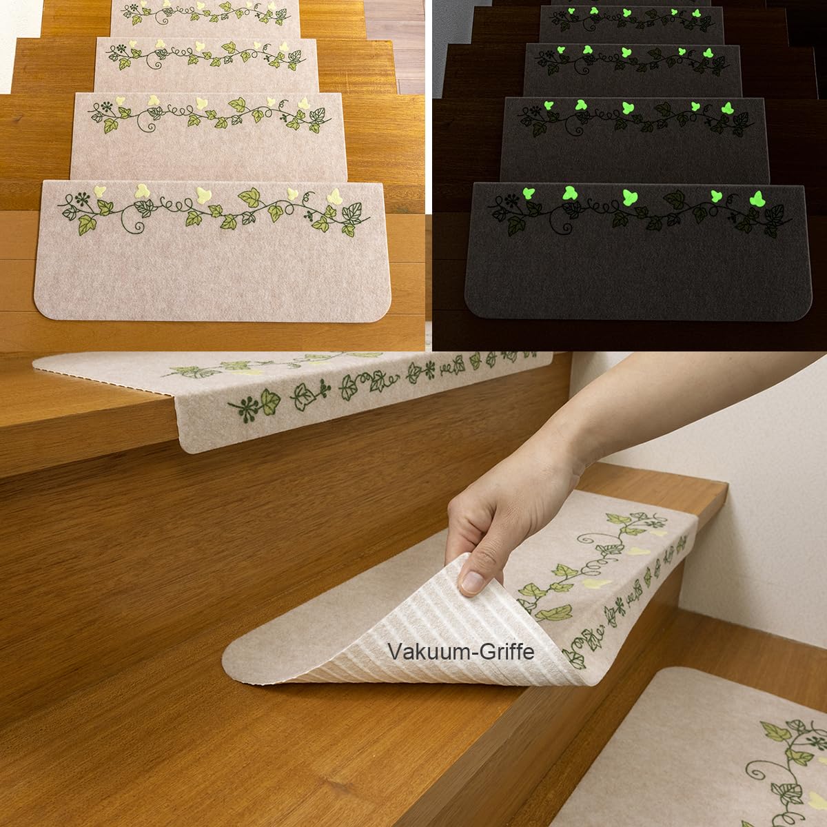 - Leuchtendes Design, das Kantenmuster der Treppenmatte ist mit lichtspeicherndem Material beschichtet, das tagsüber Licht absorbiert und nachts leuchtet, sodass Sie das Licht nicht einschalten müssen, wenn Sie nachts Treppen gehen. Leuchtstoff kann