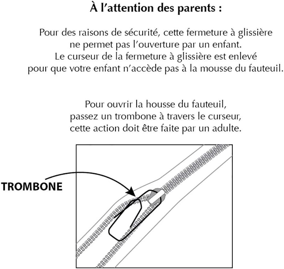 - Der Bezug ist maschinenwaschbar bei 30 °C. Für die Sicherheit Ihres Kindes ist der Schaumstoff des Sessels nicht zugänglich. Wenn Sie die Abdeckung entfernen möchten, muss ein Erwachsener den Reissverschluss mit einer Büroklammer öffnen, die in den