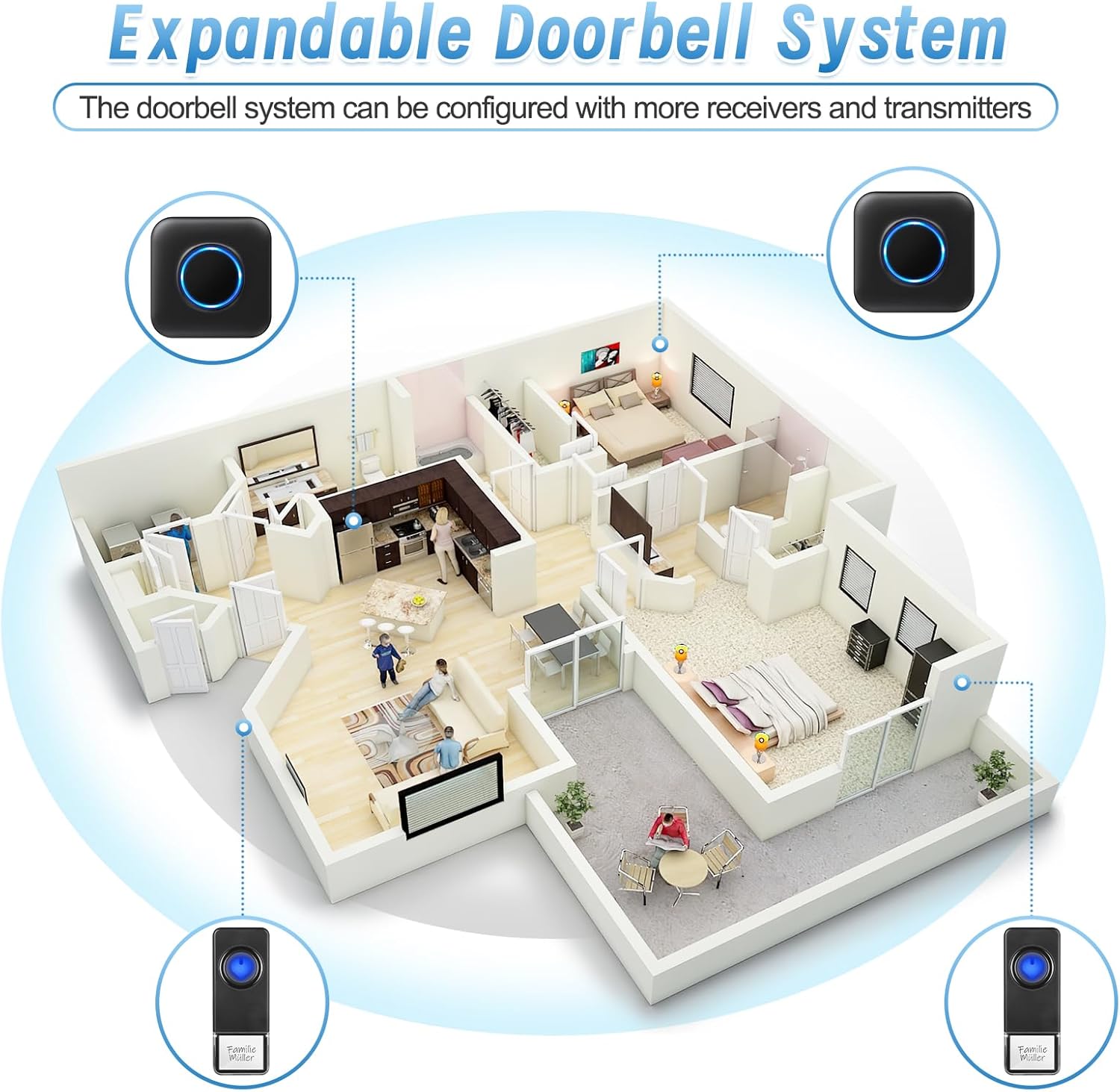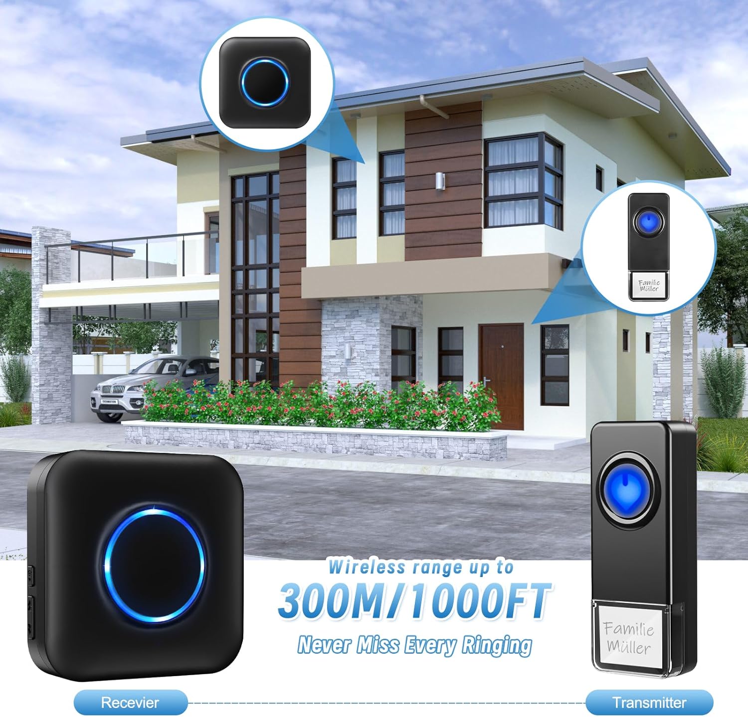 - 300M KABELLOSE REICHWEITE - Mit einer Reichweite von bis zu 300 m/1000 Fuss zwischen Sender und Empfänger werden Sie im ganzen Haus benachrichtigt, wenn jemand an Ihrer drahtlosen Türklingel klingelt. Das digitale Codesystem kann verschiedene Codes auf