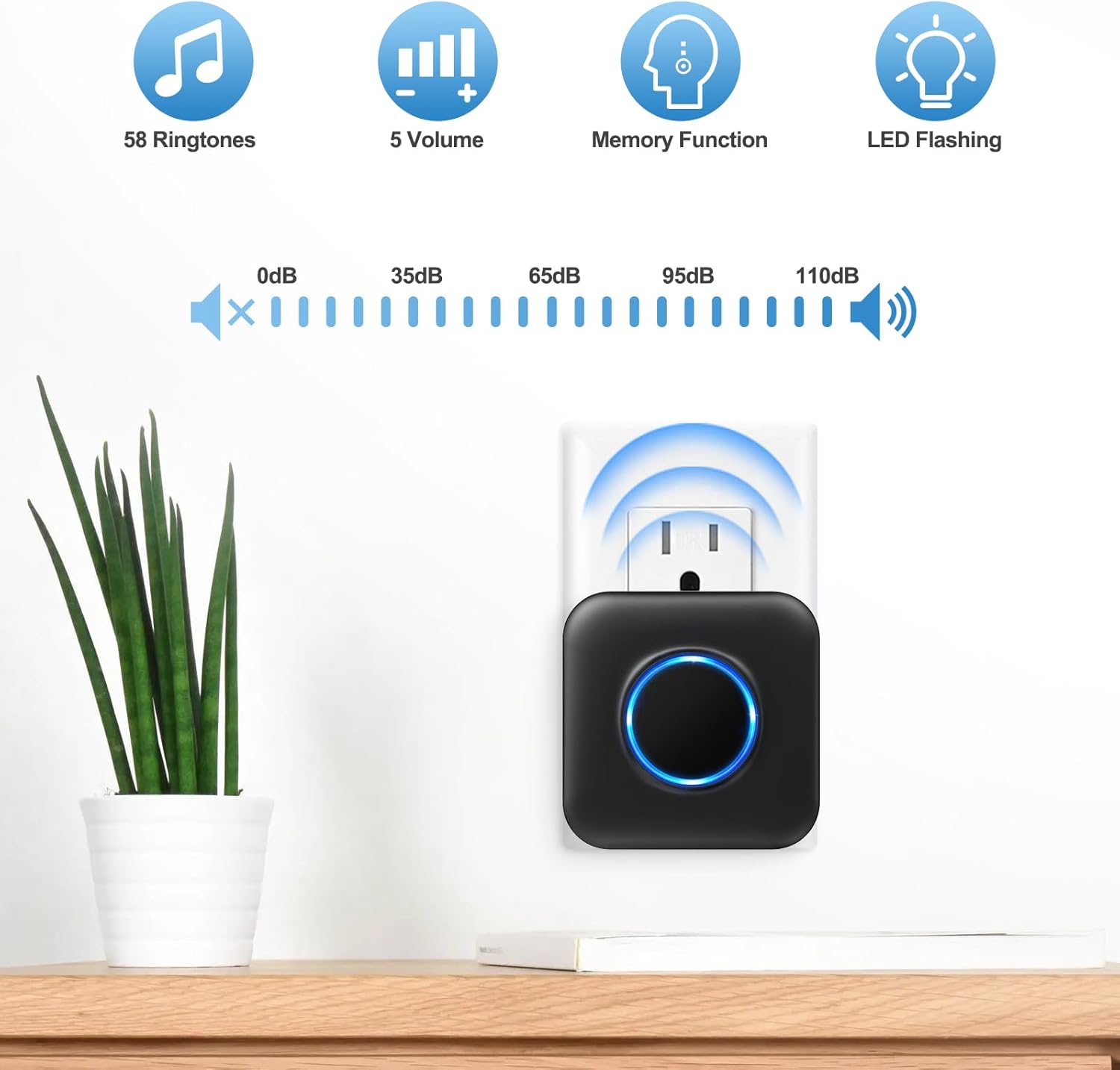 - 58 MELODIE UND 5 LAUTSTÄRKEPEGEL - Die Türklingel hat 58 verschiedene Klingeltöne. Mit 5 einstellbaren Lautstärkestufen (0-110 dB) finden Sie die perfekte Einstellung für Ihre Bedürfnisse. Darüber hinaus können LED-Leuchten auch Hörgeschädigten