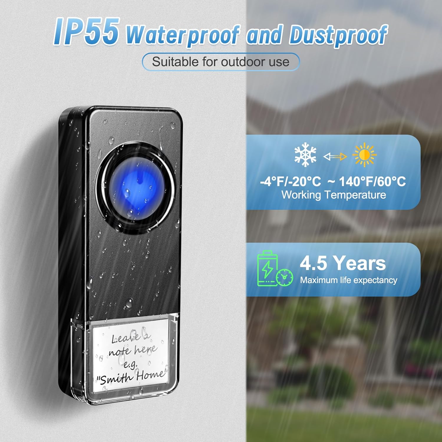- IP55 WASSERDICHT HAUSTÜRKLINGEL - Ladenklingel Aussen Sender wasserdichte Klasse ist IP55, eingebauter wasserdichter Gummiring, Regen kann auch normal funktionieren. Es kann bei -30 ° C bis 70 ° C (-86 ° F bis 158 ° F) arbeiten, das dem harten