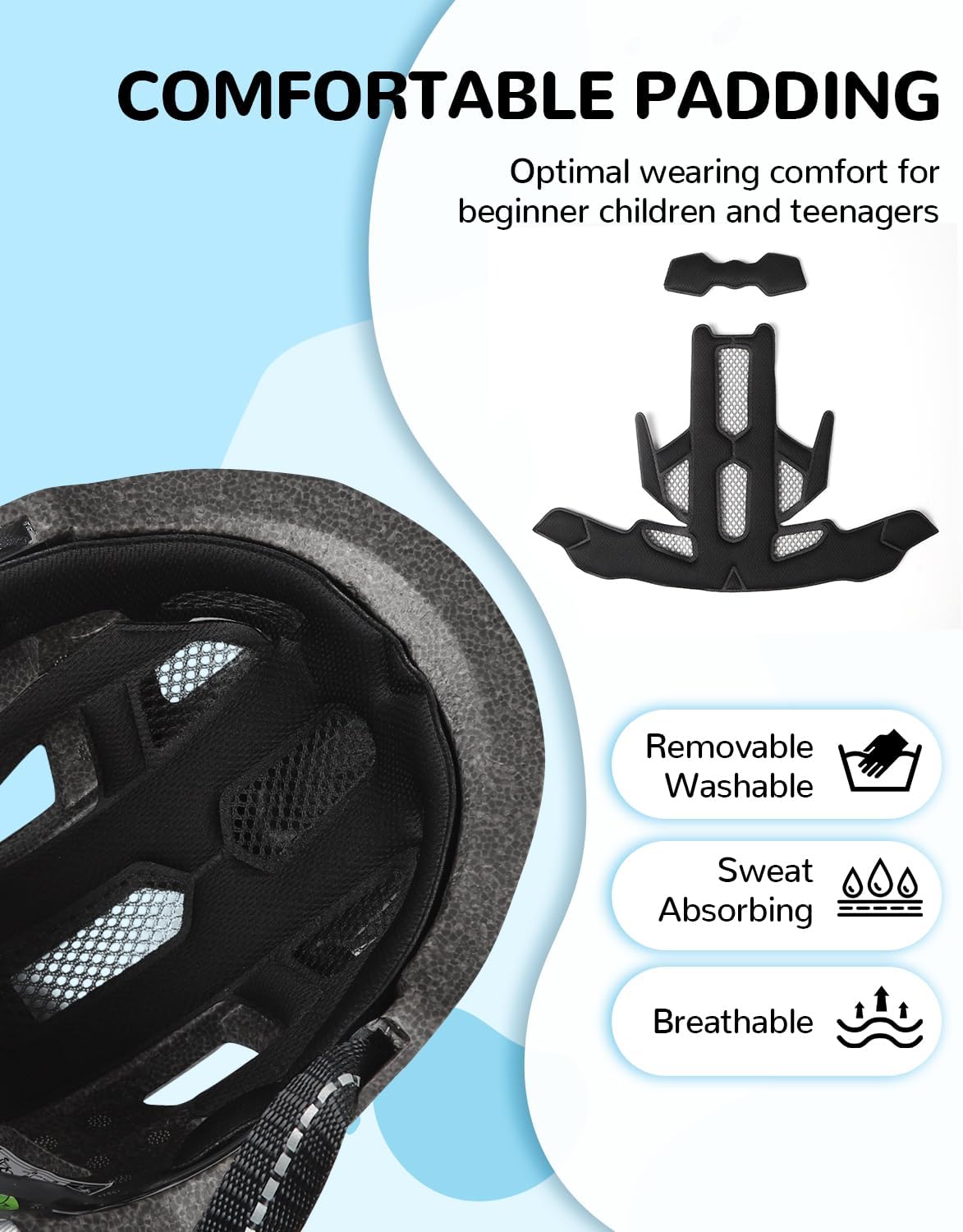 - Atmungsaktiv und Bequem zu Tragen: Der fahrradhelm kinder jungen 52-56cm mit 14 Belüftungsöffnungen für Luftzirkulation und Kühlung. Weiche Helmpolsterung für mehr Komfort - herausnehmbar und waschbar.