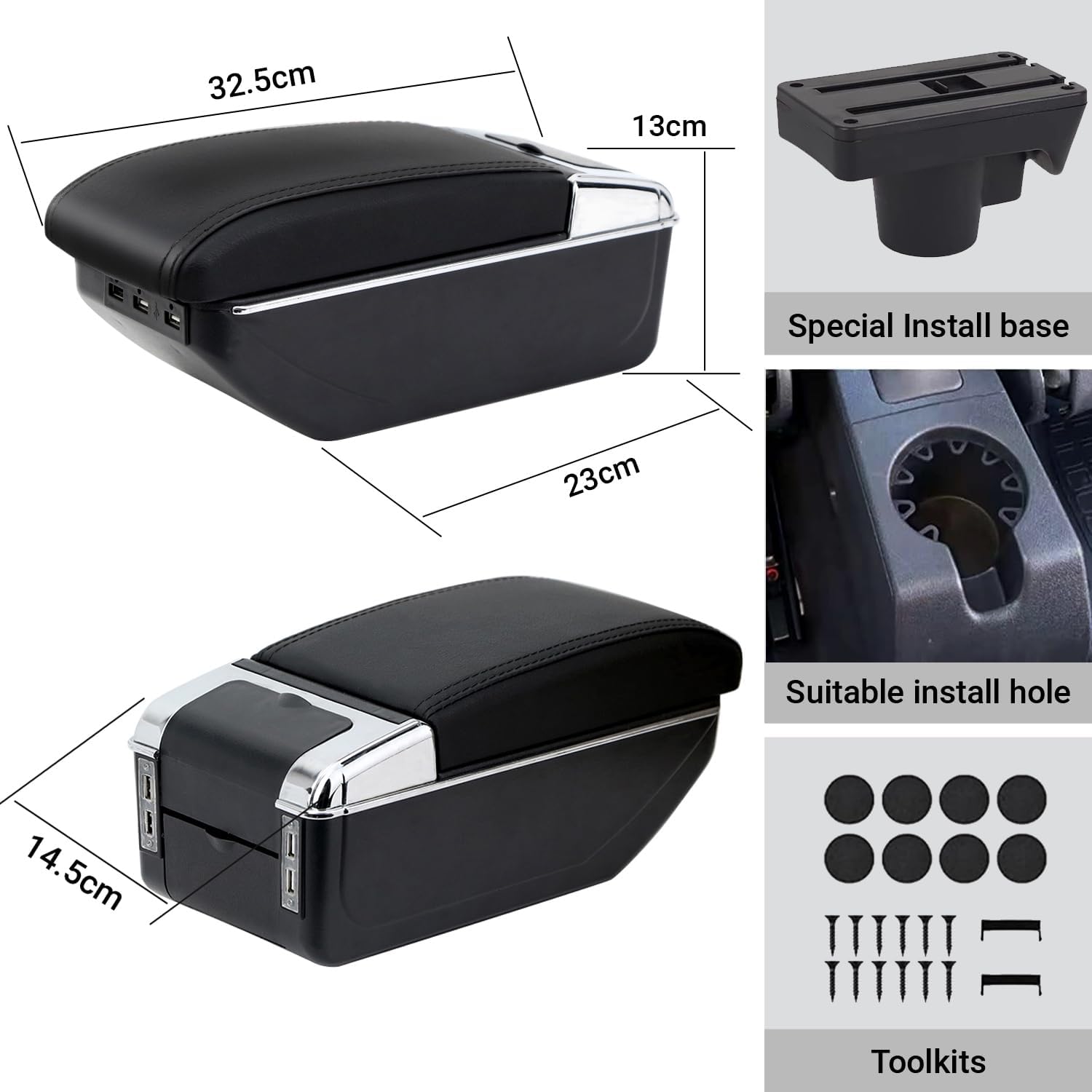 - Das zweischichtige Modell verfügt über 3 USB-Anschlüsse vorne und 4 USB-Anschlüsse hinten. 1 USB-Ladekabel. Das obere Blatt der Armlehne kann 5 cm nach vorne gleiten. Bieten Sie mehr Komfort und Bequemlichkeit beim Fahren.