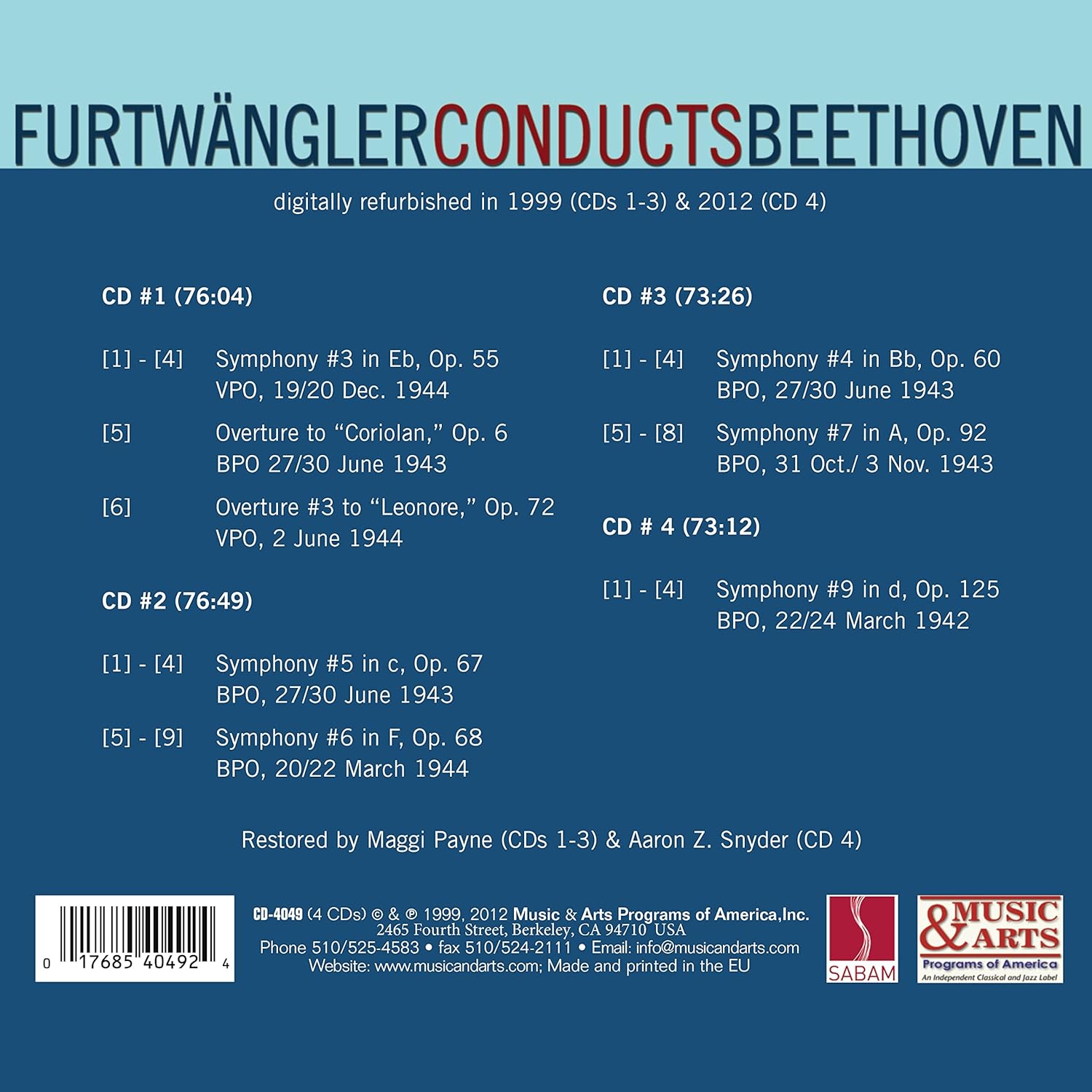 PRODUKTBESCHREIBUNGEN Für die Wiederveröffentlichung dieser Aufnahmen mit Beethoven-Interpretationen von Wilhelm Furtwängler (1886-1954) aus den Jahren 1943 und 1944 hat MUSIC & ARTS die Masterbänder nicht nur einer eingehenden Bearbeitung nach dem neuesten Stand der Technik unterzogen, es hat auch für die Aufnahme der 9. Sinfonie eine neue Quelle aufgetan, die das Tondokumente besser als jede andere bisherige Veröffentlichung klingen lässt. CD 1: Sinfonie Nr.3 Es-Dur Op.55 - Coriolan-Ouvertüre Op.6 - Leonoren-Ouvertüre Op.72 CD 2: Sinfonie Nr.5 c-Moll Op.67 - Sinfonie Nr.67 F-Dur Op.68 CD 3: Sinfonie Nr.4 B-Dur Op.60 - Sinfonie Nr.,7 A-Dur Op.92 CD 4: Sinfonie Nr.9 d-Moll Op.125