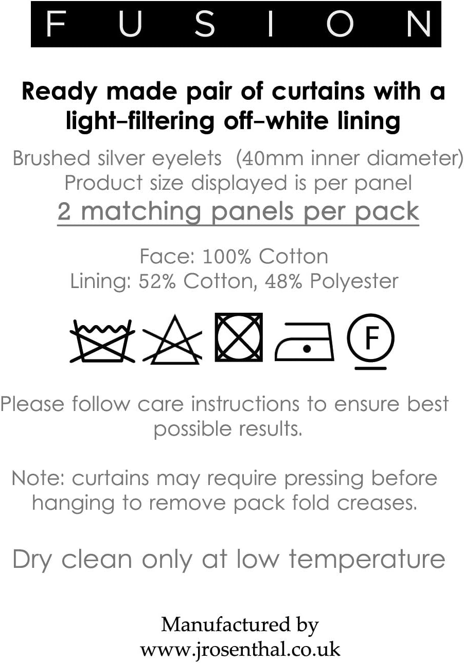- Material: 100% Baumwolle - Futter: 52% Polyester, 48% Baumwolle (Lichtfilterung / Dim out) - Pflege: Nur chemisch reinigen, Bügeleisen auf niedrigem Niveau