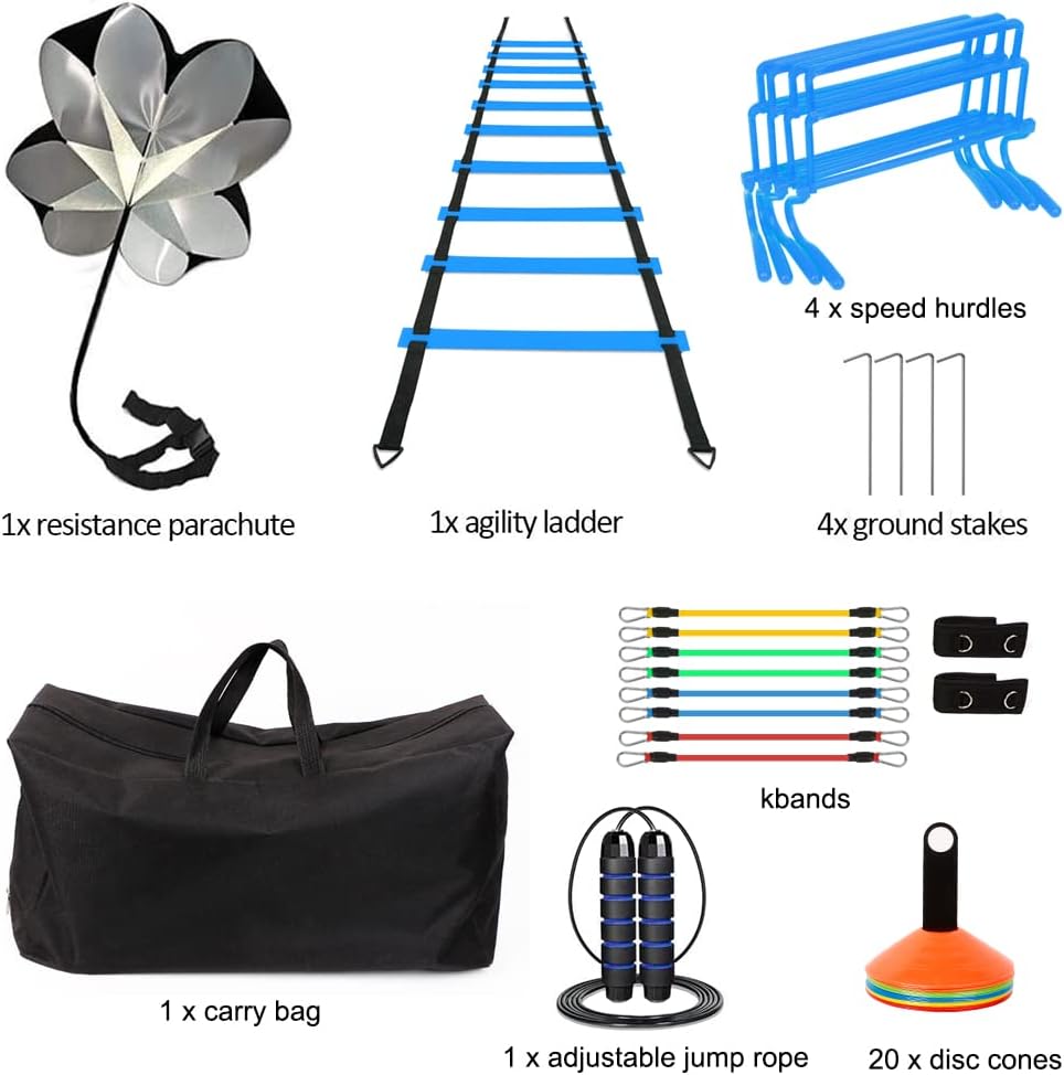 - đ Agility TrainingsgerĂ€te Kit: EnthĂ€lt Agility Leiter, Lauffallschirm, 8 WiderstandsbĂ€nder, 20 Kegel, 4 HĂŒrden, Springseil, Aufbewahrungstasche. Ob Sie ein AnfĂ€nger oder ein Experte sind, können diese GerĂ€te Ihre Trainingsanforderungen
