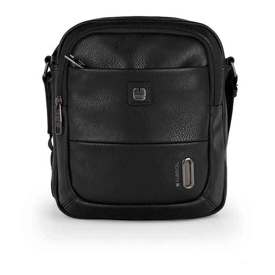 - Umhängetasche aus schwarzem Kunstleder mit mehreren Taschen.