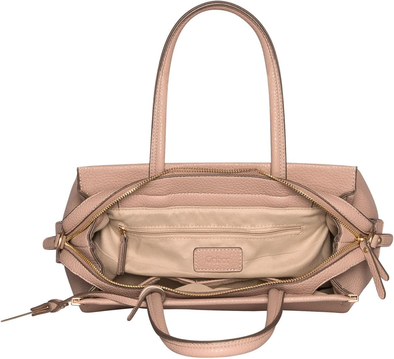 PRODUKTBESCHREIBUNGEN Die Gruppe GELA aus grob genarbtem Lederimitat in zeitlosen Farben ist dank ihrer klassischen Formgebung vielseitig kombinierbar, und das mit einer elegant-femininen Note. Mit schmückenden goldenen Metallecken und dem hochwertigen Gabor Logo Anhänger wird jede Tasche dieser Gruppe zum idealen Begleiter, egal ob City- oder Büro-Outfit. Passend zu den Taschen ist auch eine funktionale XL-Reissverschlussbörse erhältlich. Shopper mit Reissverschlussöffnung, 1 Reissverschlussrückfach. Innen 1 Reissverschlussfach, 1 Smartphone-Fach und 1 Steckfach, 2 runde Tragegriffe, 1 abnehmbarer, verstellbaren Schulterriemen, 1 abnehmbarer Gabor-Anhänger.