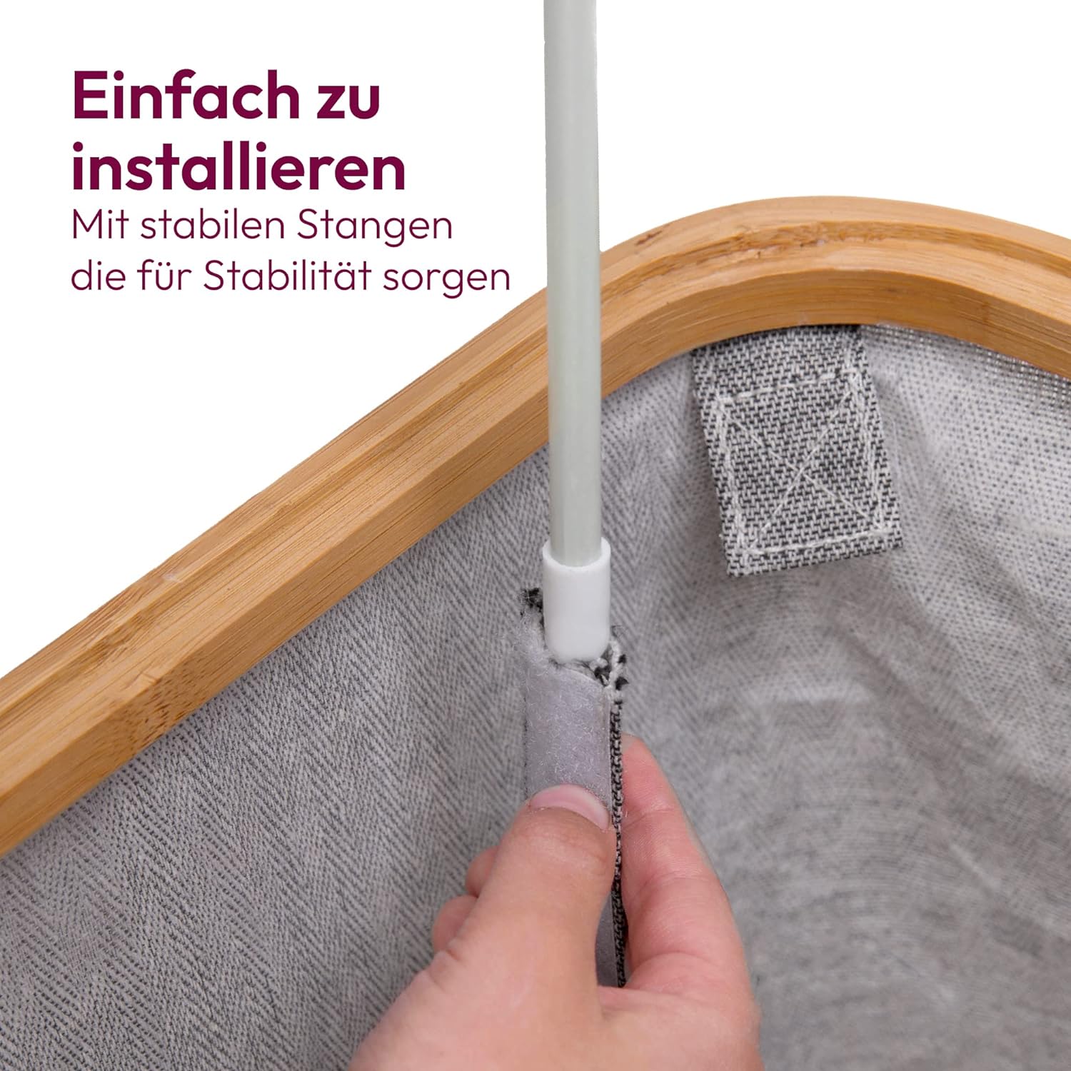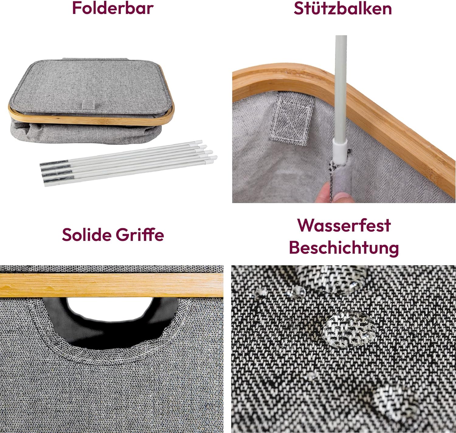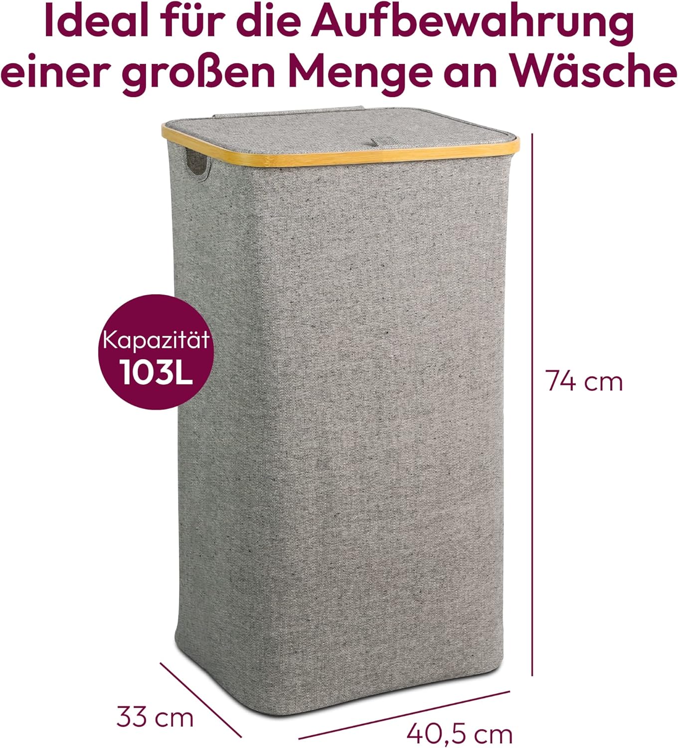 • STILVOLLES DESIGN - Das graue Stoff mit Bambuskante verleiht ihm einen trendigen und modernen Look. Und der Deckel hält Ihre Schmutzwäsche ausser Sichtweite.