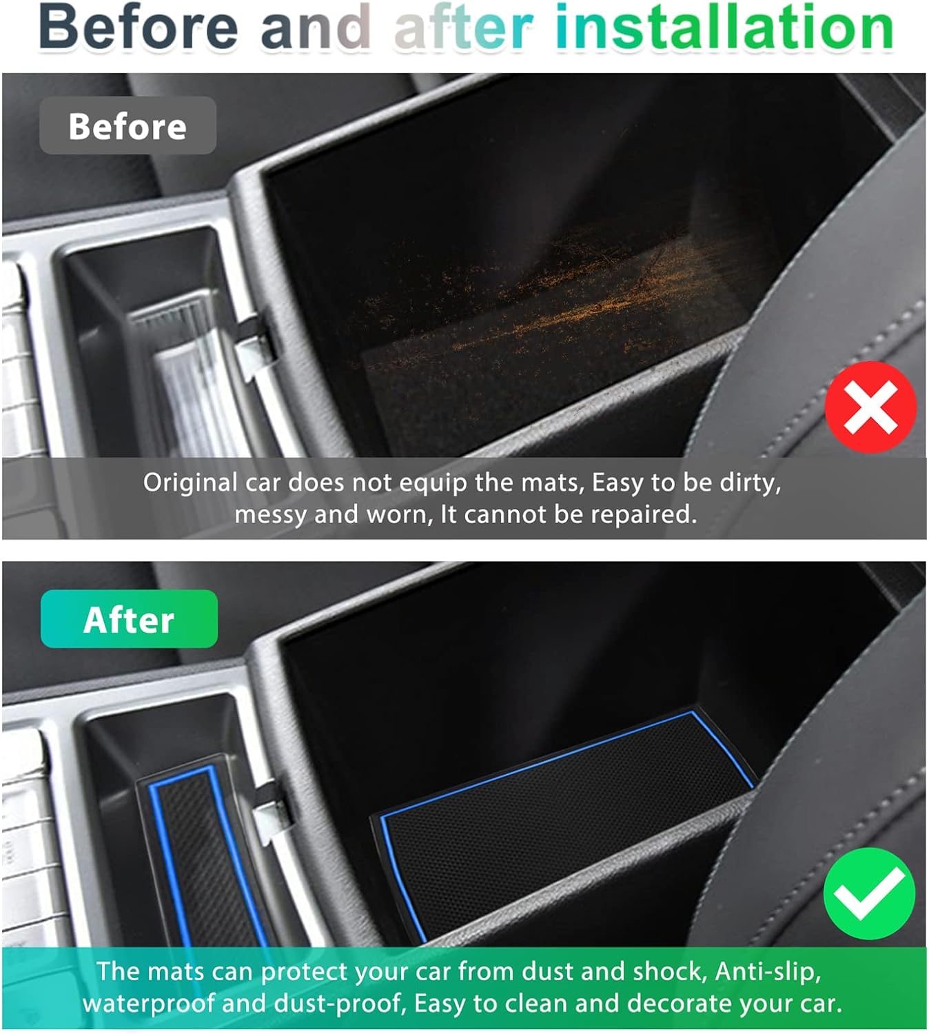 • 【Umfassender Schutz des Autos】 Es wird in verschiedenen Autoinnenräumen wie Aufbewahrungsboxen, Getränkehaltern, Türschlitzen, Mittelkonsolen usw. verwendet, die das Auto effektiv sauber und ordentlich halten können.