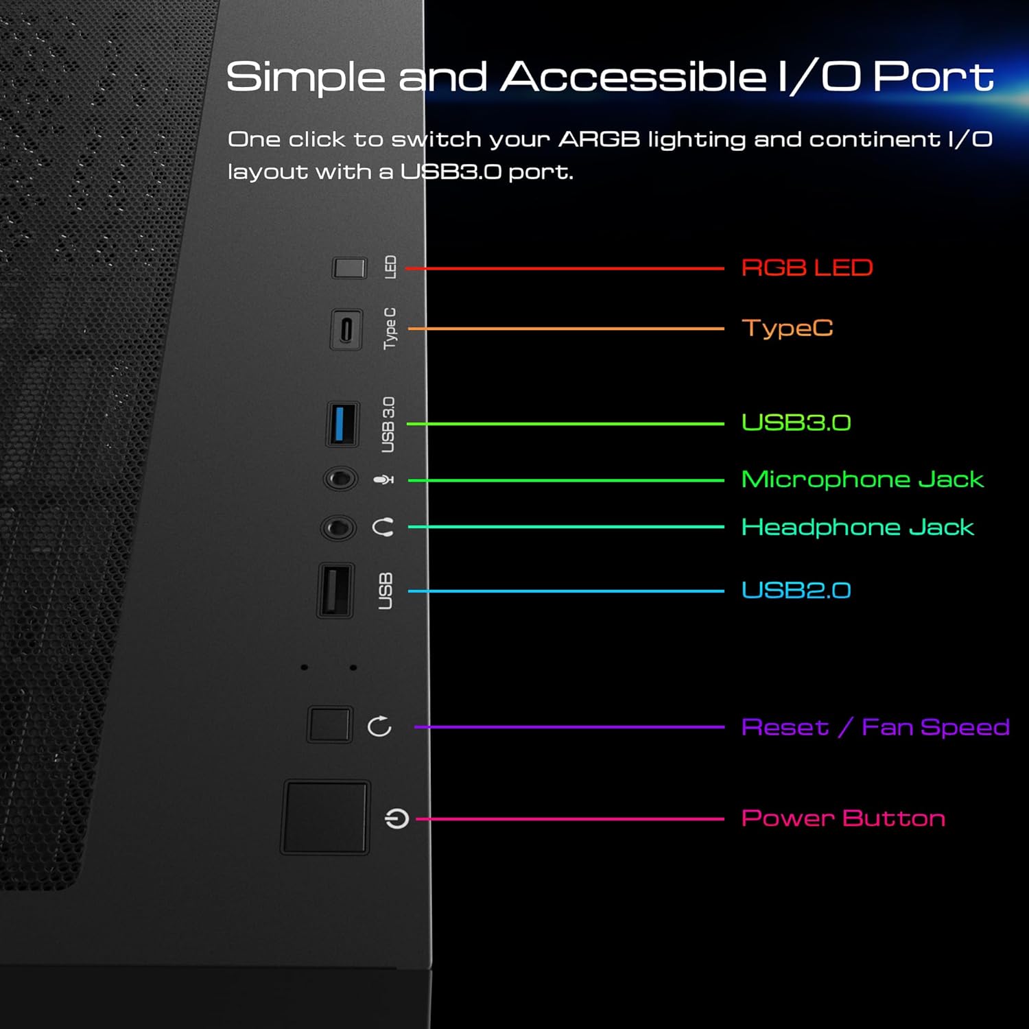 - Gen 2 Type-C-Schnittstelle: Das I/O-Panel verfügt über einen USB 3.2 Gen 2 Type-C-Anschluss für hohe Übertragungsgeschwindigkeiten von bis zu 10 Gbit/s, einen USB 3.0-Anschluss, einen zusätzlichen USB-Anschluss, LED-Beleuchtungssteuerungen und