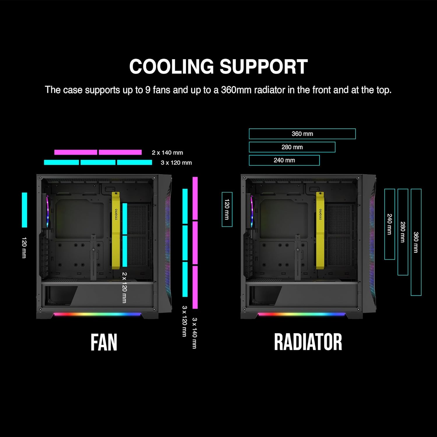 - Hochleistungs-ARGB-Lüfter: Das Gehäuse ist mit vier Hochleistungslüftern ausgestattet, die einen hohen statischen Druck für eine optimierte Luftstromführung bieten. Die Lüfter verfügen über vollständig adressierbare, flache ARGB-Beleuchtung, die