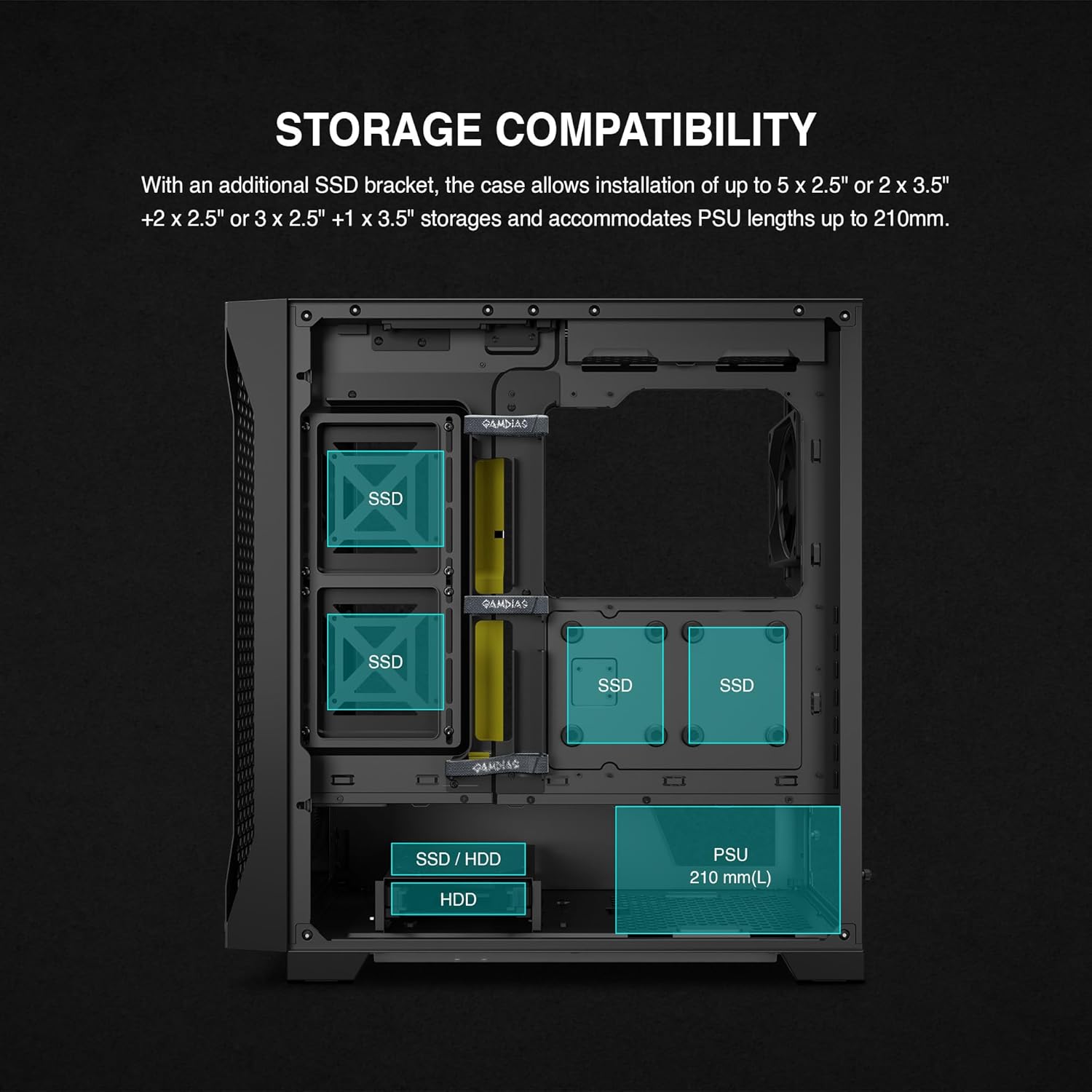 - Innenraum: Der ATHENA P1 unterstützt ATX-Motherboards und VGA-Karten mit einer Länge von bis zu 405 mm und einer Breite von bis zu 145 mm. Das Gehäuse unterstützt bis zu 9 Lüfter und einen 360-mm-Radiator an der Vorderseite und oben.
