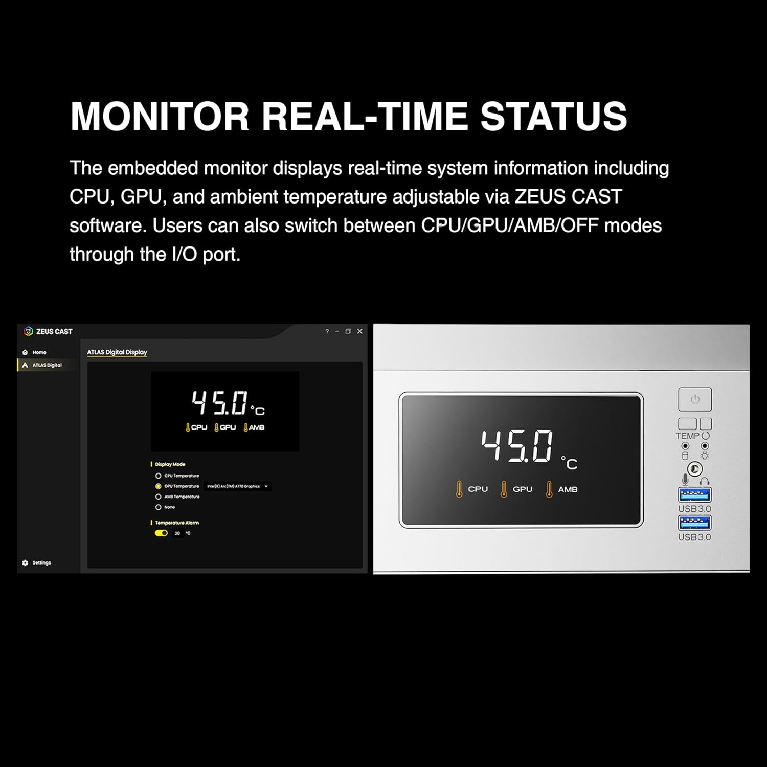 - [Echtzeit-Status Überwachen] Der integrierte Monitor zeigt Echtzeit-Systeminformationen wie CPU-, GPU- und Umgebungstemperatur an, die über die ZEUS CAST-Software anpassbar sind. Benutzer können bequem zwischen den Modi CPU, GPU, AMB und AUS über das