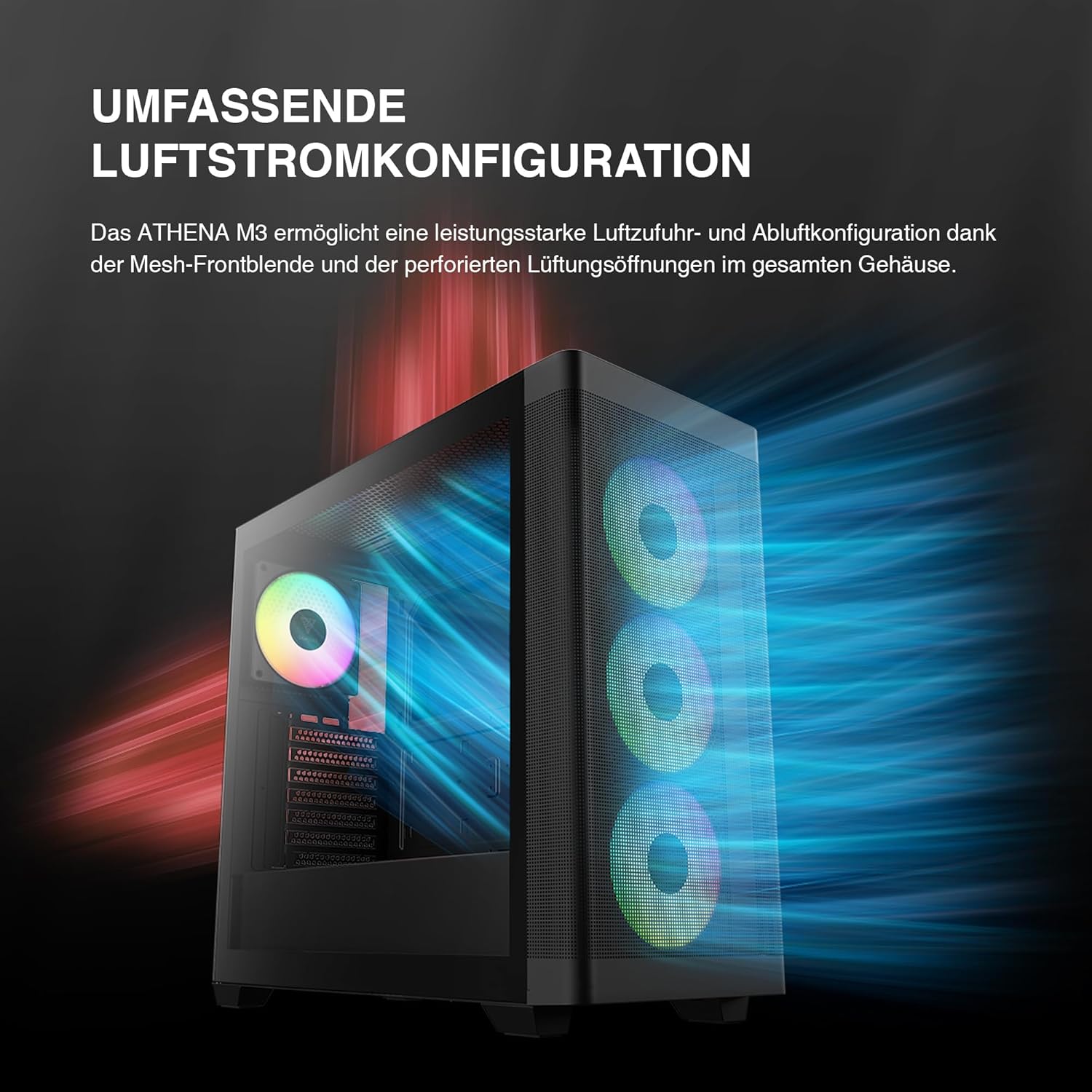 - [Umfassende Luftstromkonfiguration] Das ATHENA M3 bietet überlegene Luftzirkulation mit einer Mesh-Frontblende und strategisch platzierten perforierten Lüftungsschlitzen für flexible Zu- und Abluftoptionen.