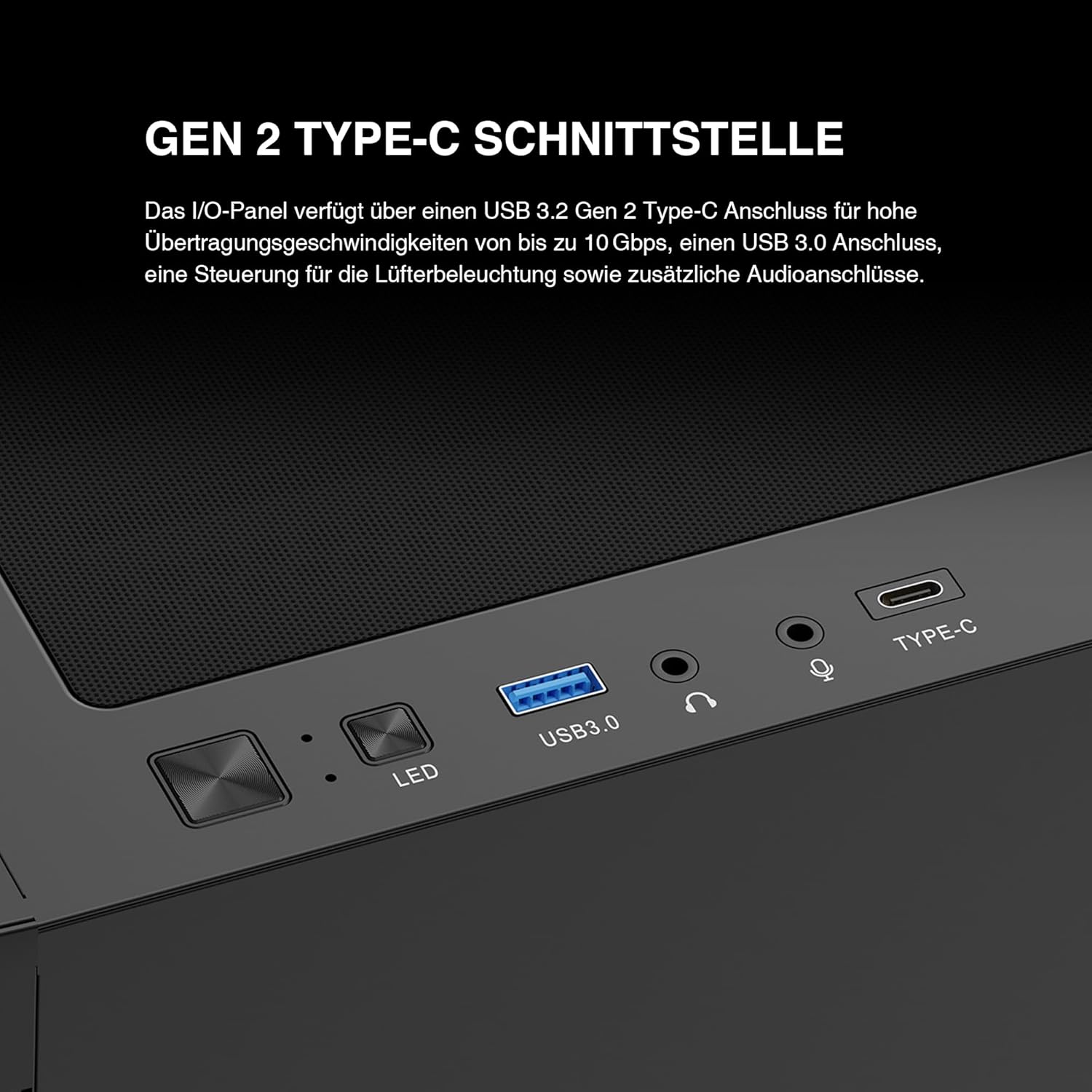 - [Gen 2 Type-C-Schnittstelle] Das I/O-Panel verfügt über einen USB 3.2 Gen 2 Type-C-Anschluss für blitzschnelle Übertragungsgeschwindigkeiten von bis zu 10 Gbps, einen USB 3.0-Anschluss, Lüfter-LED-Steuerungen und zusätzliche Audioanschlüsse.
