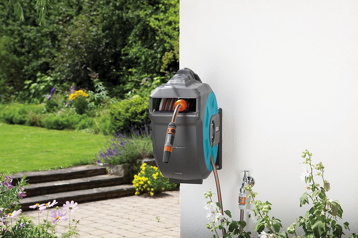 - Lieferumfang beinhaltet: 1x Komplettset mit 1x Schlauchbox, 1x 35 m Gardena Qualitätsschlauch (Durchmesser 13 mm, 1/2 Zoll), 1x Spritze, 1x Wandhalterung mit Schrauben, Dübeln und Montagehilfe