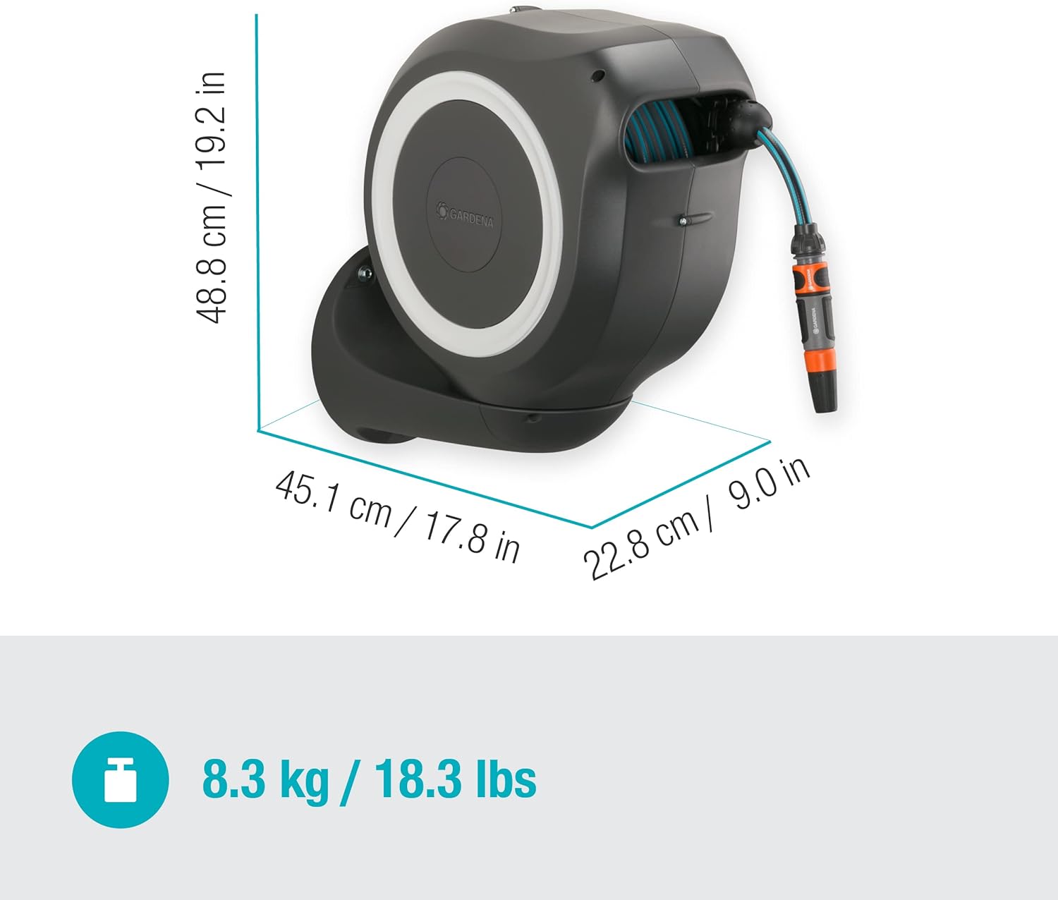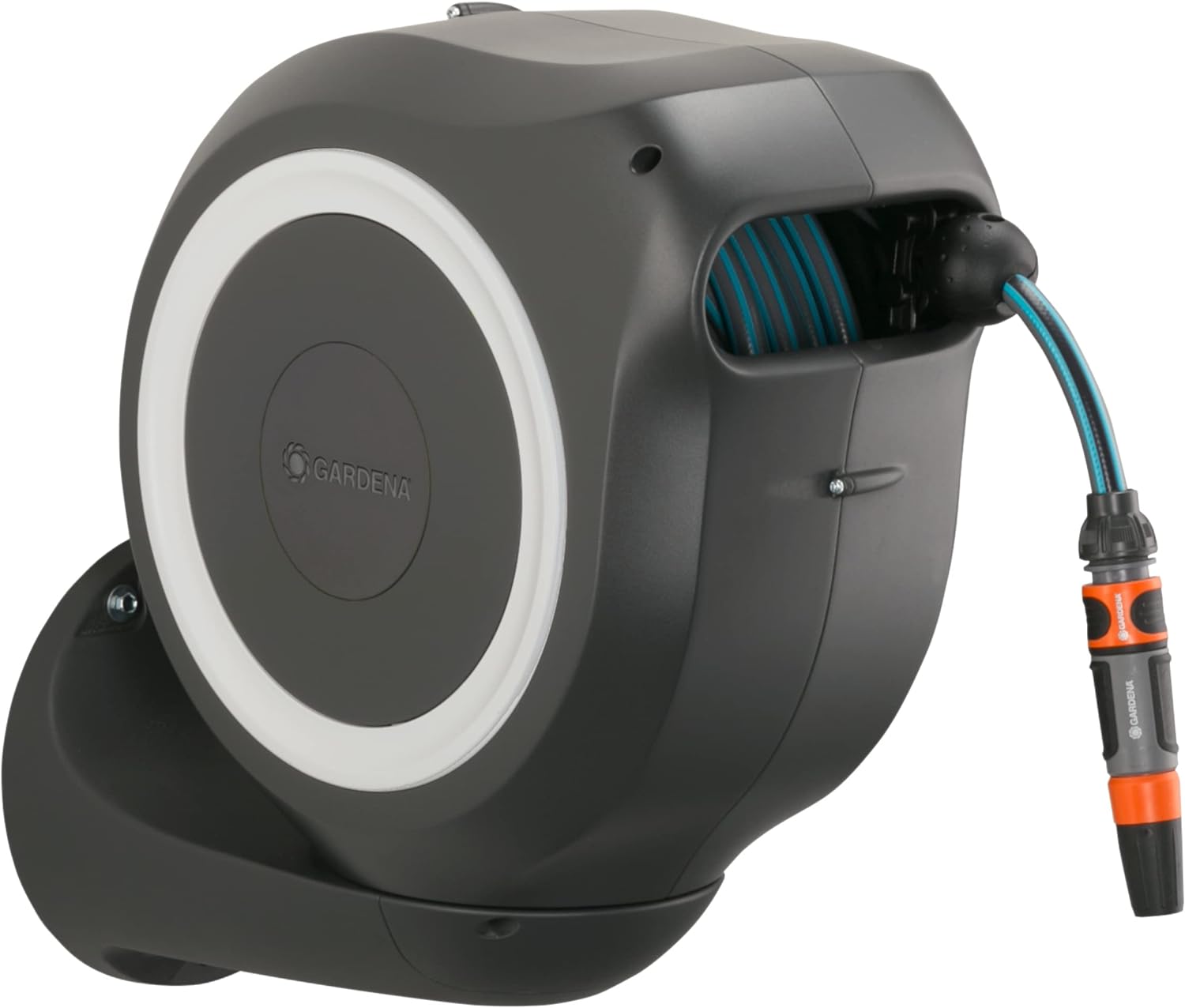 • Lieferumfang: 1x Gardena Wand-Schlauchbox, 1x 20 m Gardena Qualitätsschlauch (11 mm), 1x Anschlussschlauch, 1x Spritze, 1x Wandhalterung mit Schrauben, Dübeln und Montagehilfe