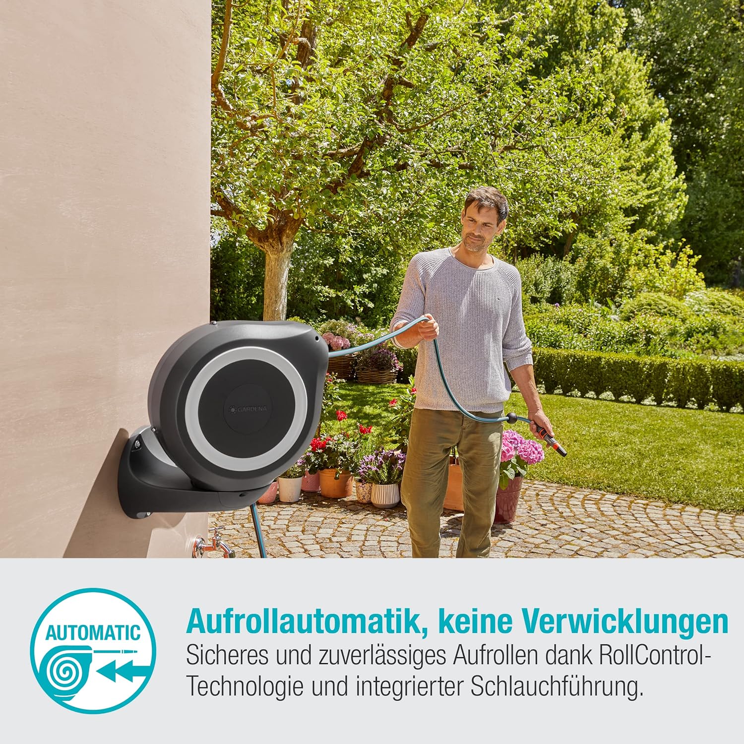 • Langlebige Aufroll-Technologie: Automatisches, sicheres und zuverlässiges Aufrollen dank Fliehkraftbremse und integrierter Schlauchführung – gleichmässiger Einzug ohne dass sich der Schlauch verknotet oder abknickt