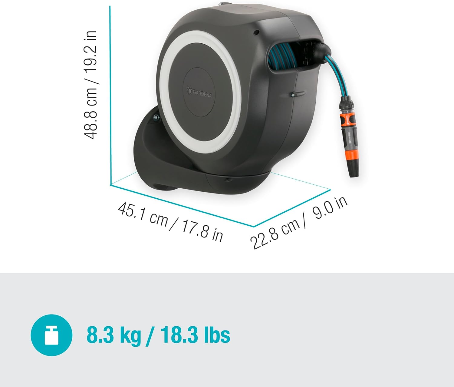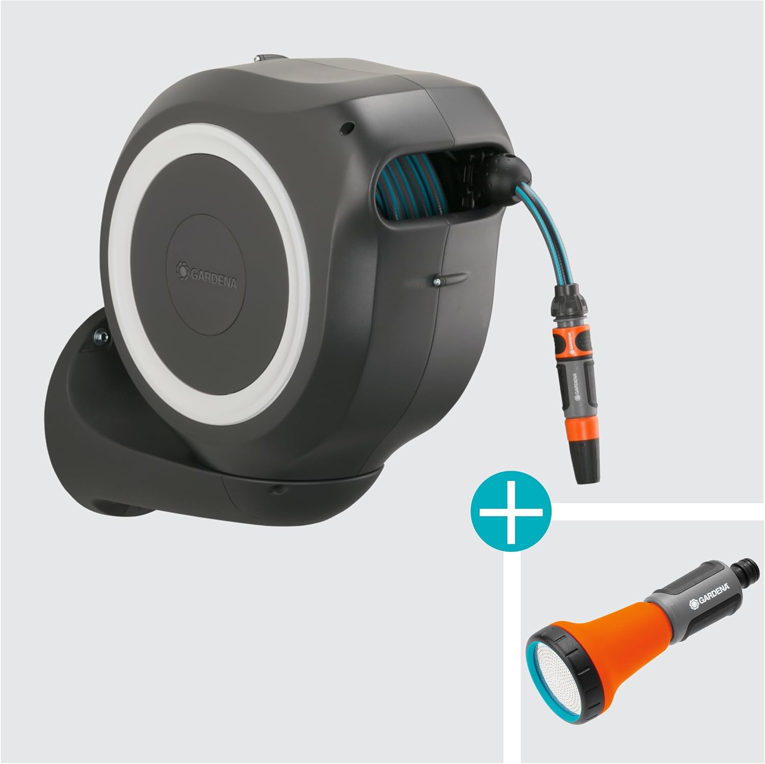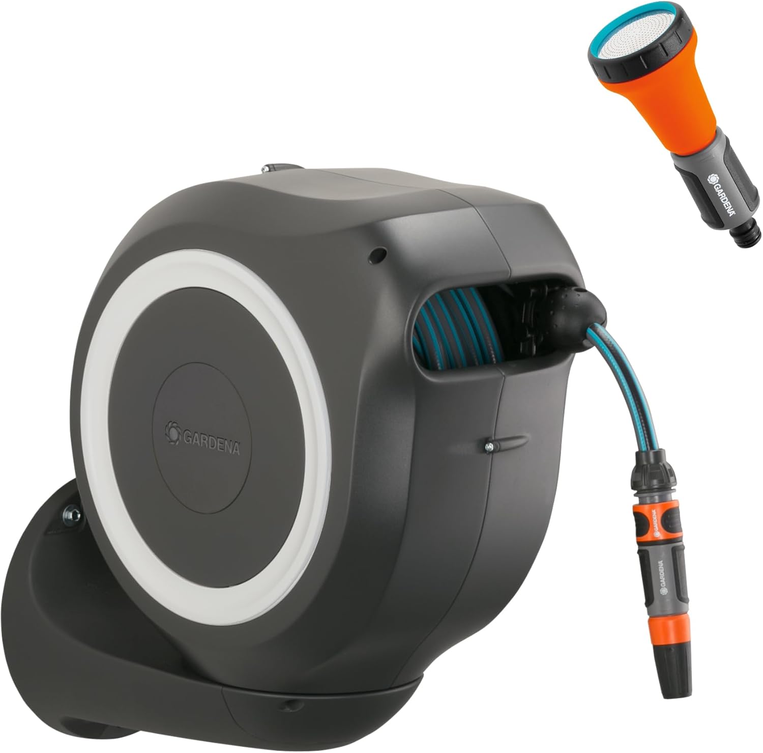 • Lieferumfang: 1x Gardena Wand-Schlauchbox, 1x Bewässerungsbrause, 1x 20 m Qualitätsschlauch (11 mm), 1x Anschlussschlauch, 1x Spritze, 1x Wandhalterung mit Schrauben und Dübeln