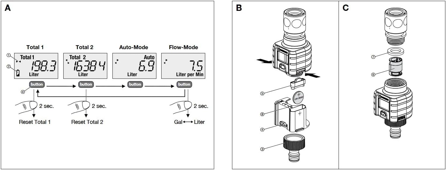 - Einfache Bedienung: Auf dem übersichtlichen Display lässt sich per Knopfdruck der Wasserverbrauch pro Tag, Jahreszeit, Bewässerungszyklus oder der aktuelle Durchfluss (Liter/Minute) anzeigen
