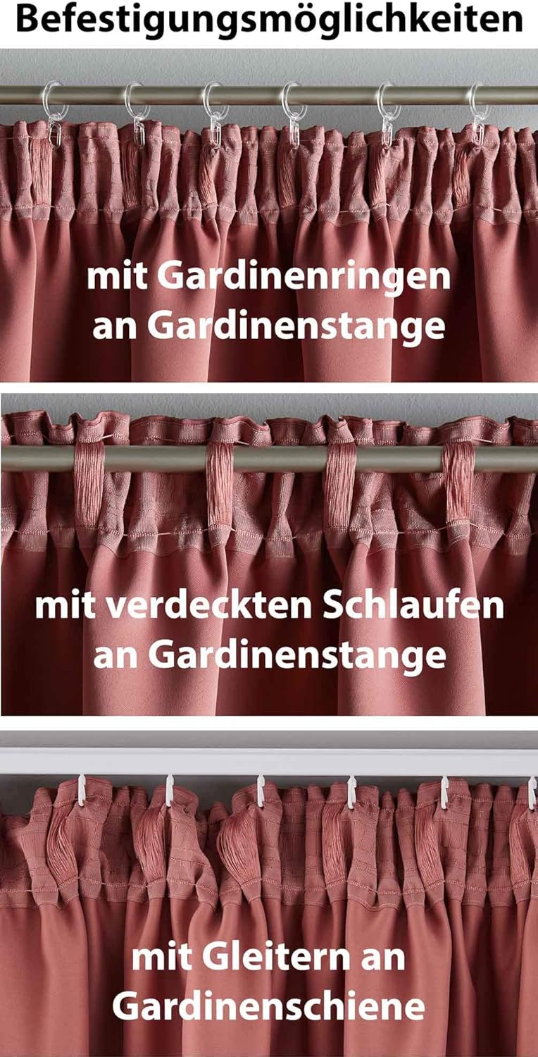 - Die Aufhängung an vorhandene Gardinenstangen erfolgt bequem mit verdeckten Schlaufen an eine Gardinenstange oder mit dem eingenähten Gardinenband und Gleitern an Gardinenschienen. Die Lieferung erfolgt mit einem Raffhalter in passender Farbe.