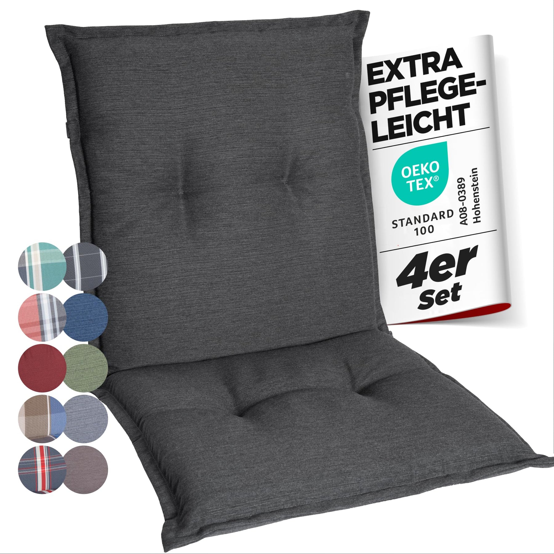 - ✔STANDARD 100 – Unsere Gartenstuhl Auflagen bzw. Polsterauflagen für Niedriglehner sind besonders hautfreundlich und komfortabel sowie gemässStandard 100 schadstofffrei.