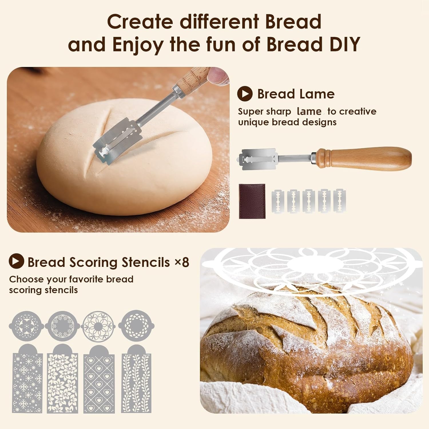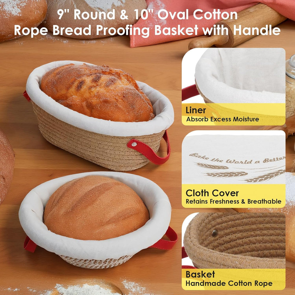 - Komplettes Sauerteigbrot-Set: Lieferumfang: runder Gärkorb (23 cm), ovaler Gärkorb (25 cm), 2 Leineneinlagen, 2 Stoffhüllen, Metallschaber, Kunststoffschaber, Teigbesen, Brotbackmesser + 5 Klingen, Silikon-Brotschlinge